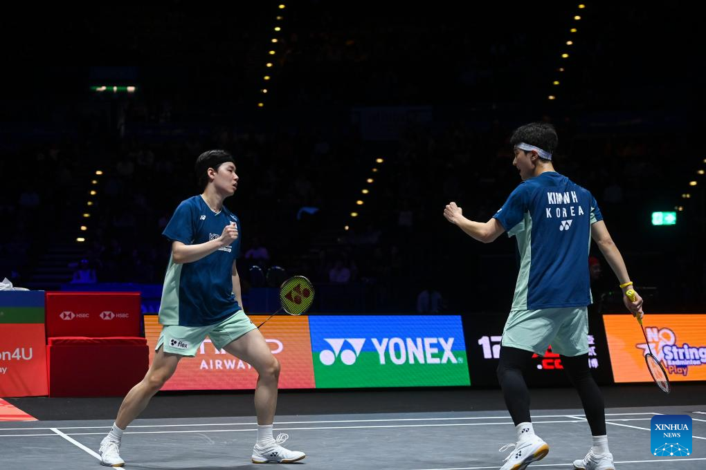 Kim Won Ho/Seo Seung Jae (L) celebrate scoring during the men's doubles semifinal between He Jiting/Ren Xiangyu of China and Kim Won Ho/Seo Seung Jae of South Korea at the All England Open Badminton Championships 2025 in Birmingham, Britain, March 15, 2025. (Xinhua/Wu Lu)
