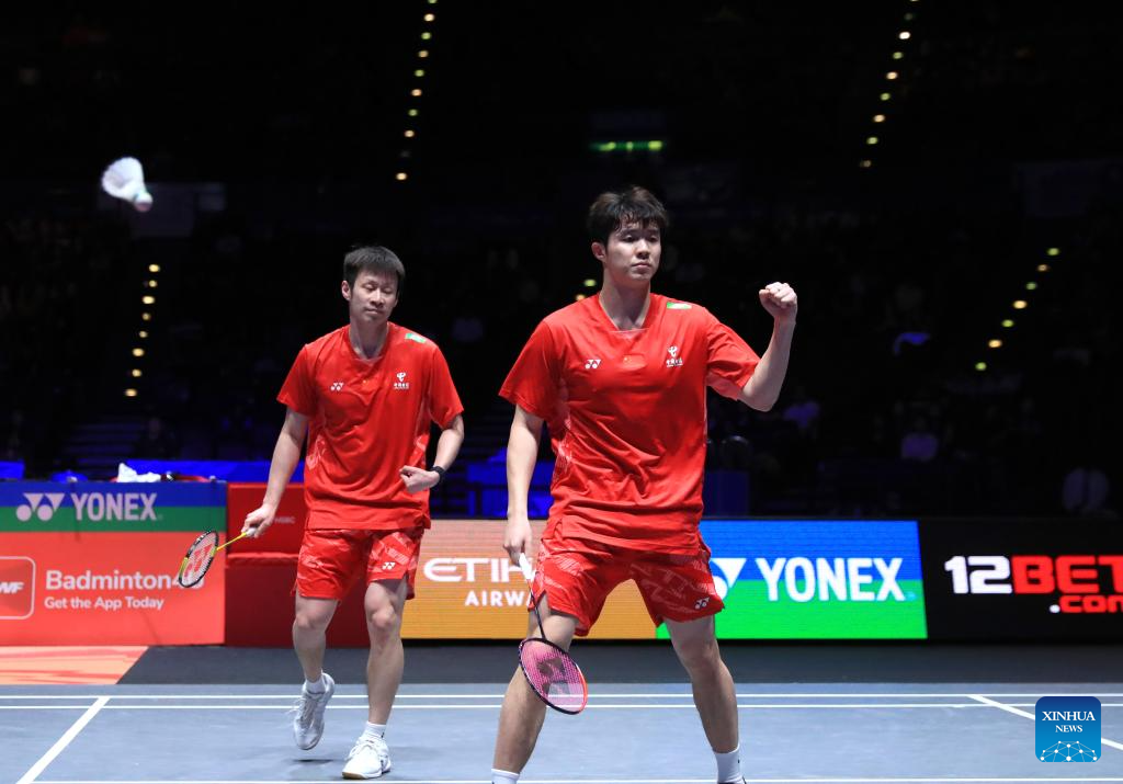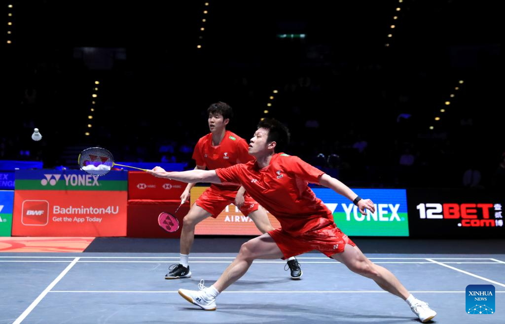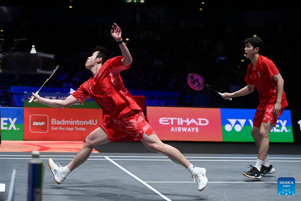He Jiting/Ren Xiangyu (L) compete during the men's doubles semifinal between He Jiting/Ren Xiangyu of China and Kim Won Ho/Seo Seung Jae of South Korea at the All England Open Badminton Championships 2025 in Birmingham, Britain, March 15, 2025. (Xinhua/Wu Lu)