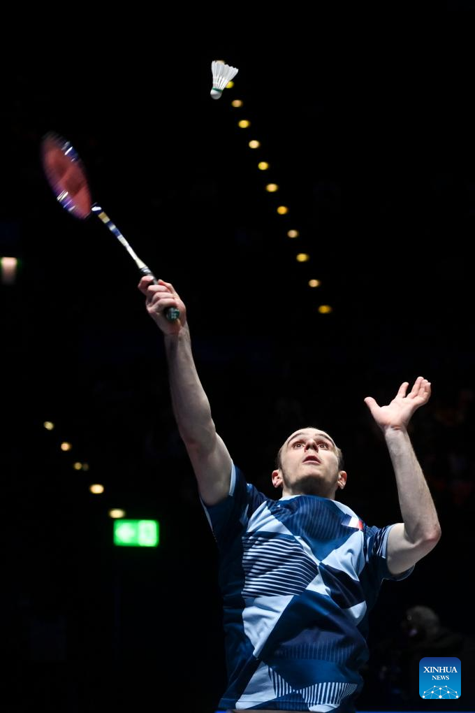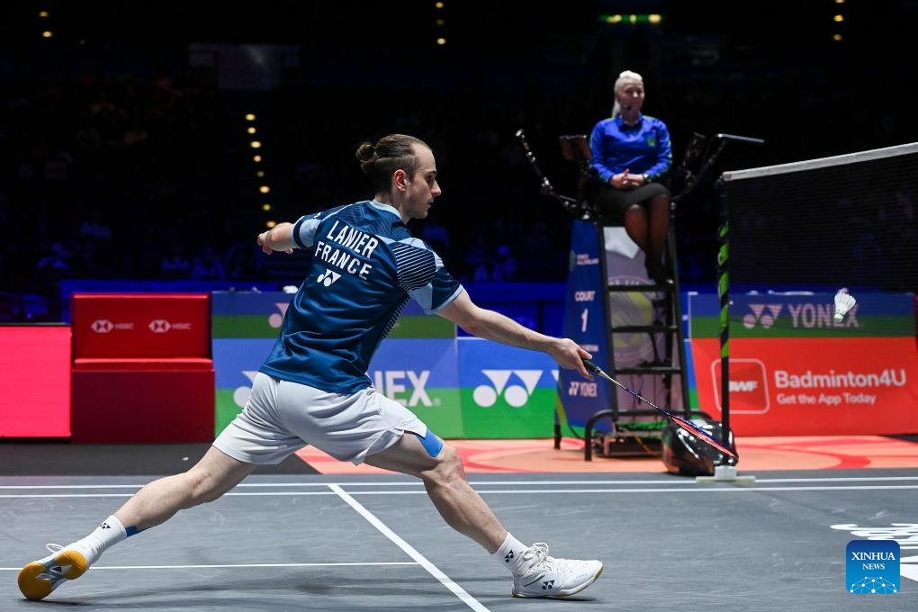 Alex Lanier hits a return during the men's singles semifinal between Lee Chia Hao of Chinese Taipei and Alex Lanier of France at All England Open Badminton Championships 2025 in Birmingham, Britain, March 15, 2025. (Xinhua/Wu Lu)