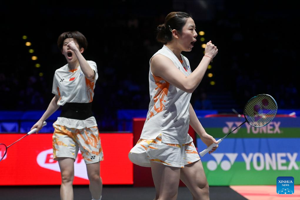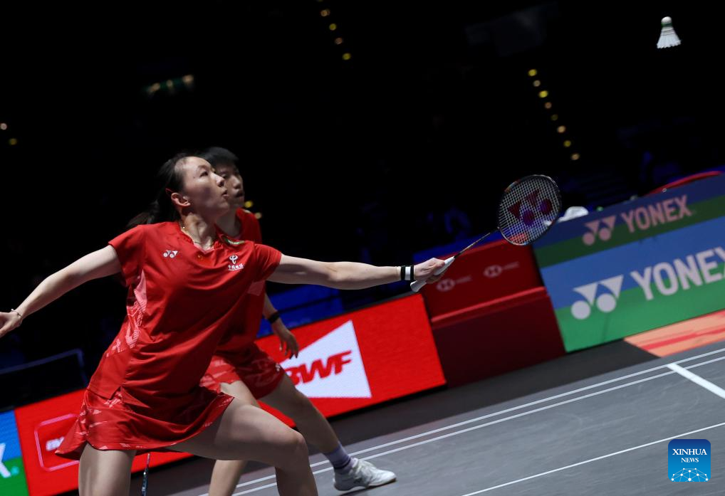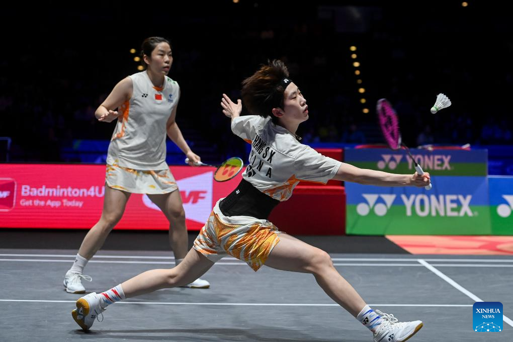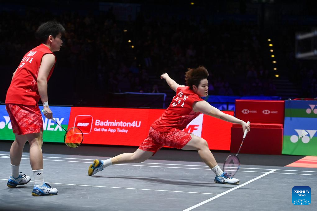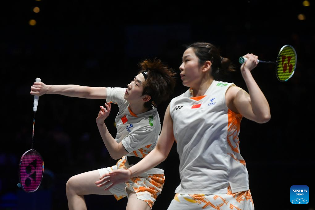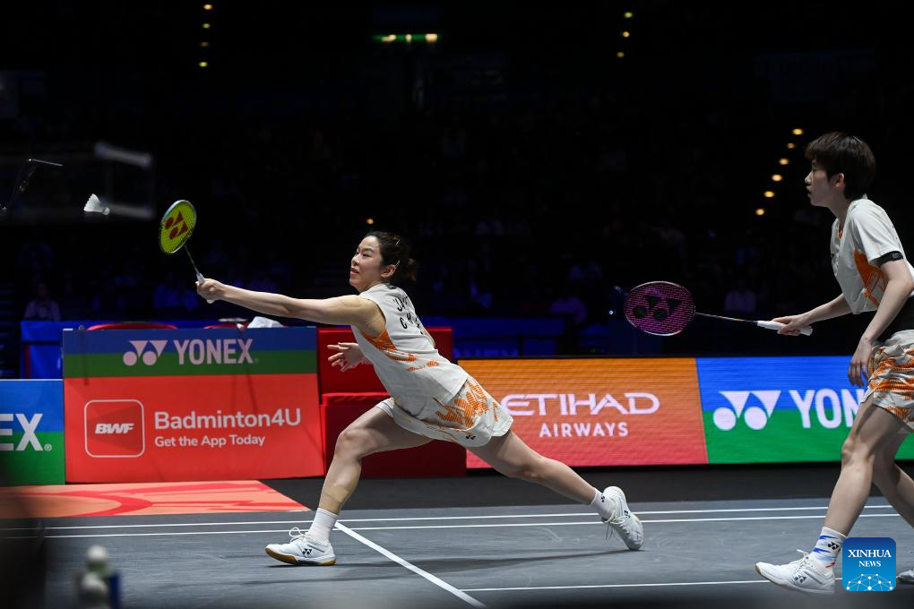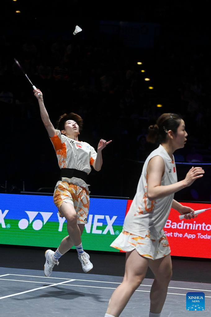 Jia Yifan (R)/Zhang Shuxian compete during the women's doubles semifinal between Jia Yifan/Zhang Shuxian of China and Fukushima Yuki/Matsumoto Mayu of Japan at All England Open Badminton Championships 2025 in Birmingham, Britain, March 15, 2025. (Xinhua/Wu Lu)