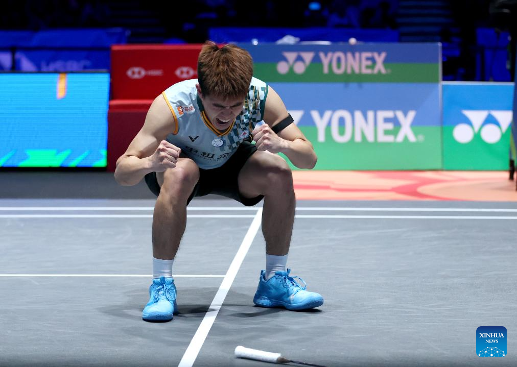 Lee Chia Hao celebrates after winning the men's singles semifinal between Lee Chia Hao of Chinese Taipei and Alex Lanier of France at All England Open Badminton Championships 2025 in Birmingham, Britain, March 15, 2025. (Xinhua/Li Ying)