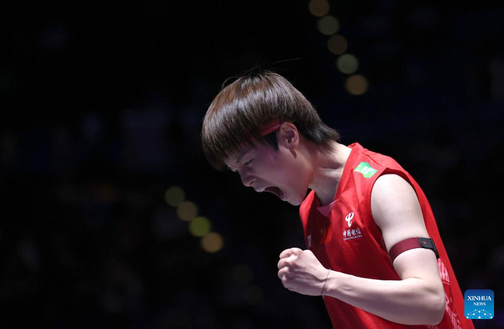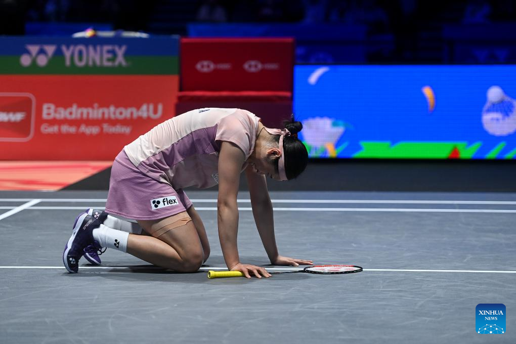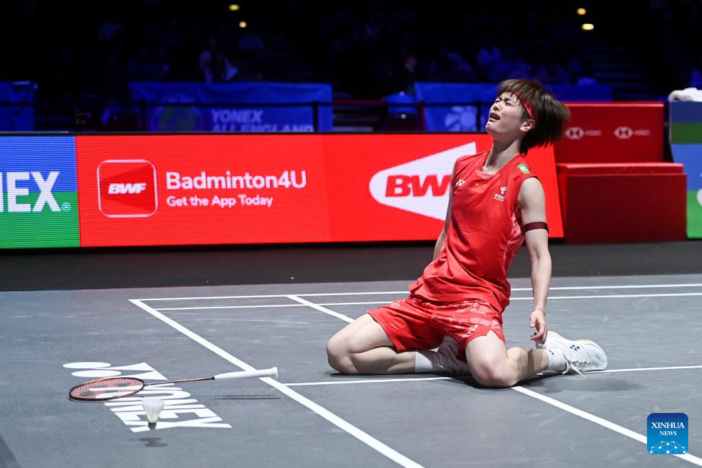 Wang Zhiyi reacts after winning the women's singles semifinal between Wang Zhiyi of China and Han Yue of China at the All England Open Badminton Championships 2025 in Birmingham, Britain, March 15, 2025. (Xinhua/Li Ying)
