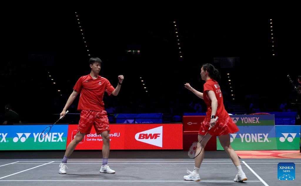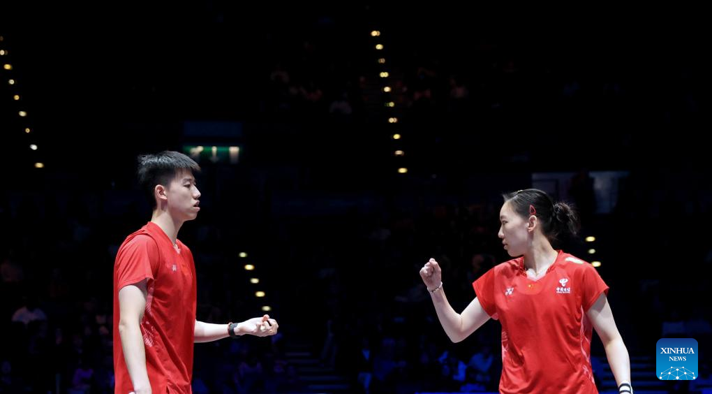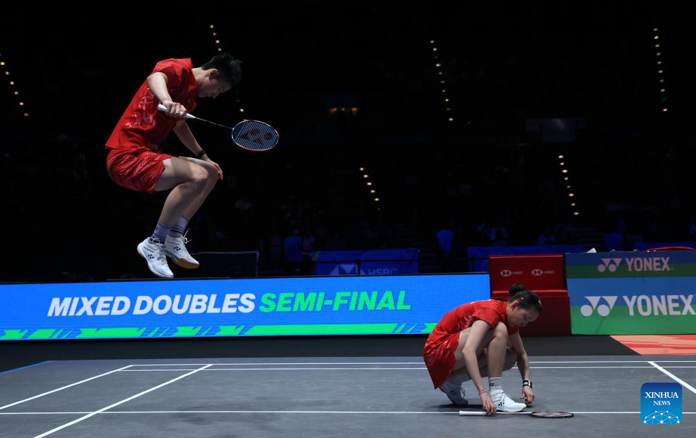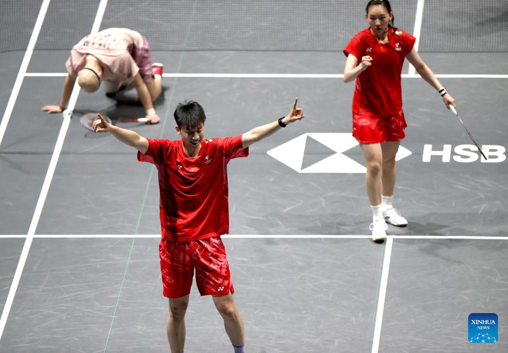 Feng Yanzhe (L)/Wei Yaxin celebrate after winning the mixed doubles semifinal between Feng Yanzhe/Wei Yaxin of China and Lee Jong Min/Chae Yu Jung of South Korea at the All England Open Badminton Championships 2025 in Birmingham, Britain, March 15, 2025. (Xinhua/Li Ying)