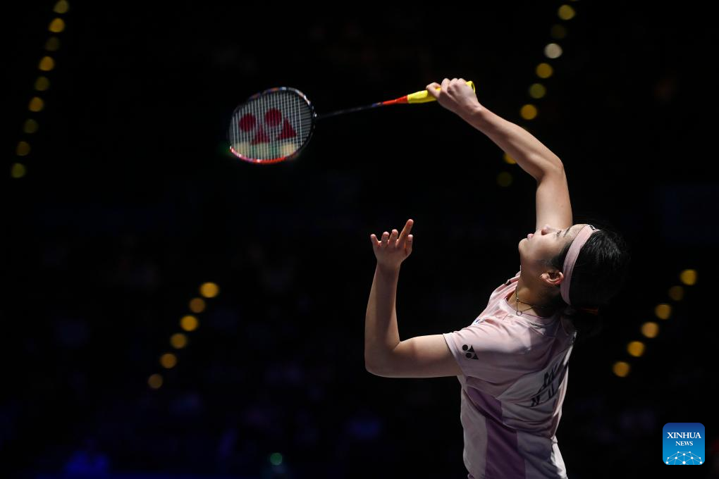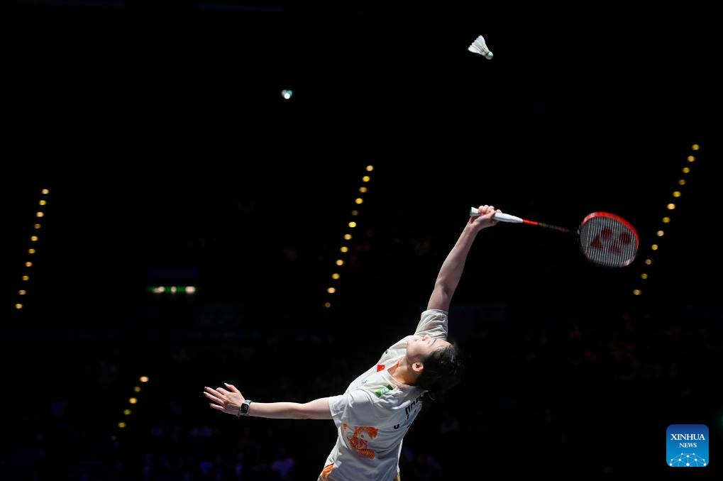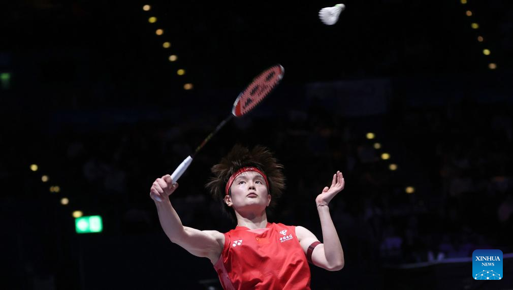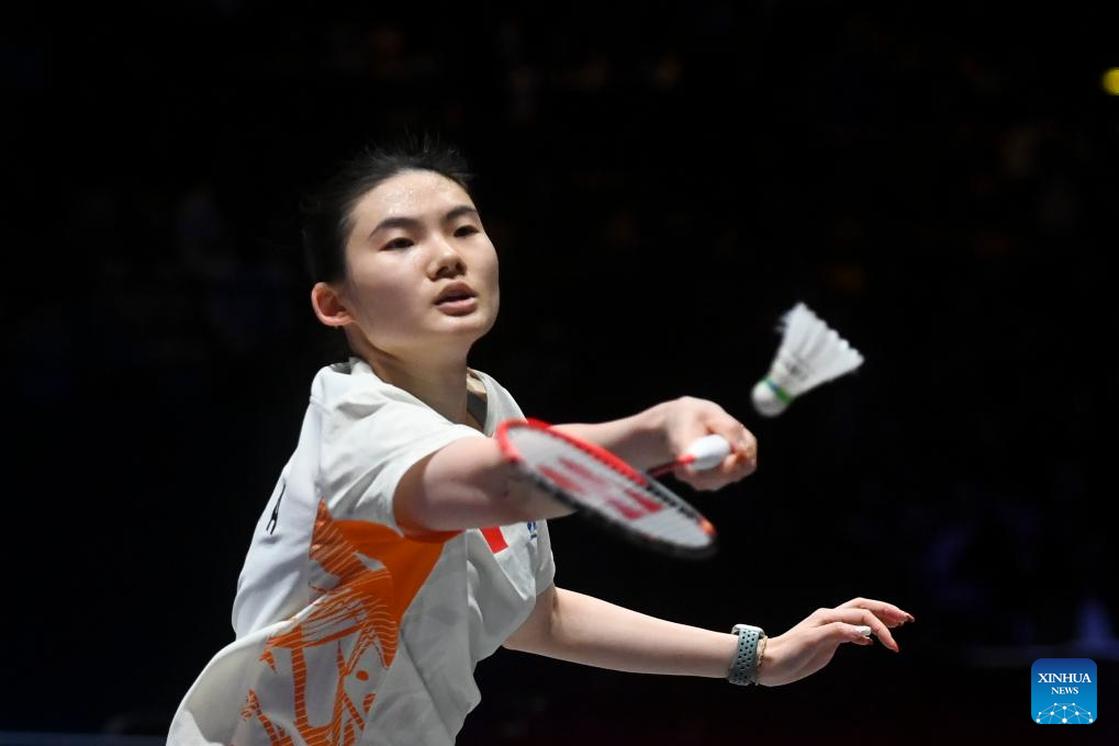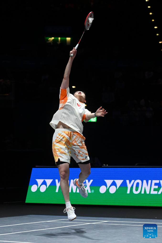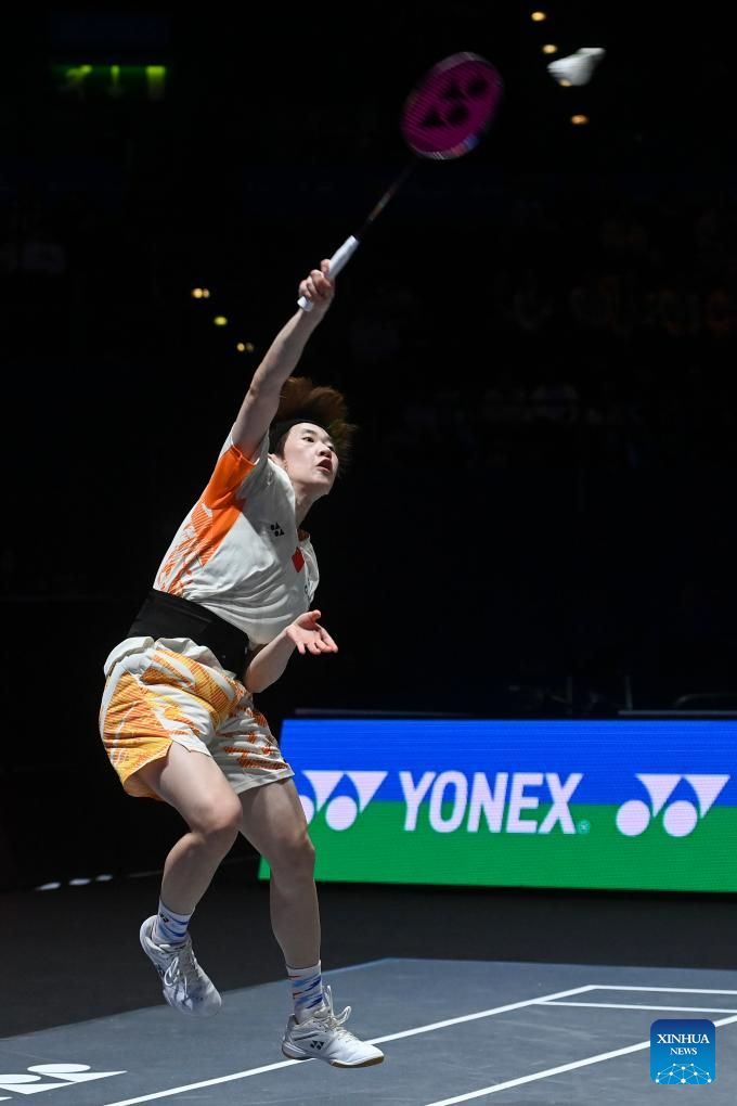 Wang Zhiyi hits a return during the women's singles semifinal between Wang Zhiyi of China and Han Yue of China at the All England Open Badminton Championships 2025 in Birmingham, Britain, March 15, 2025. (Xinhua/Li Ying)