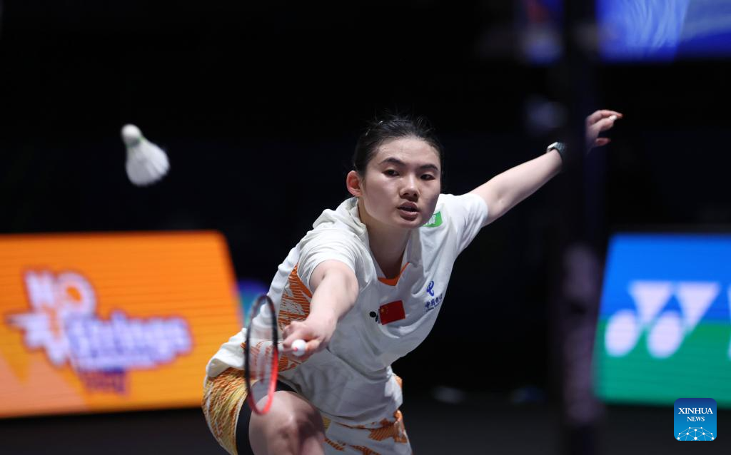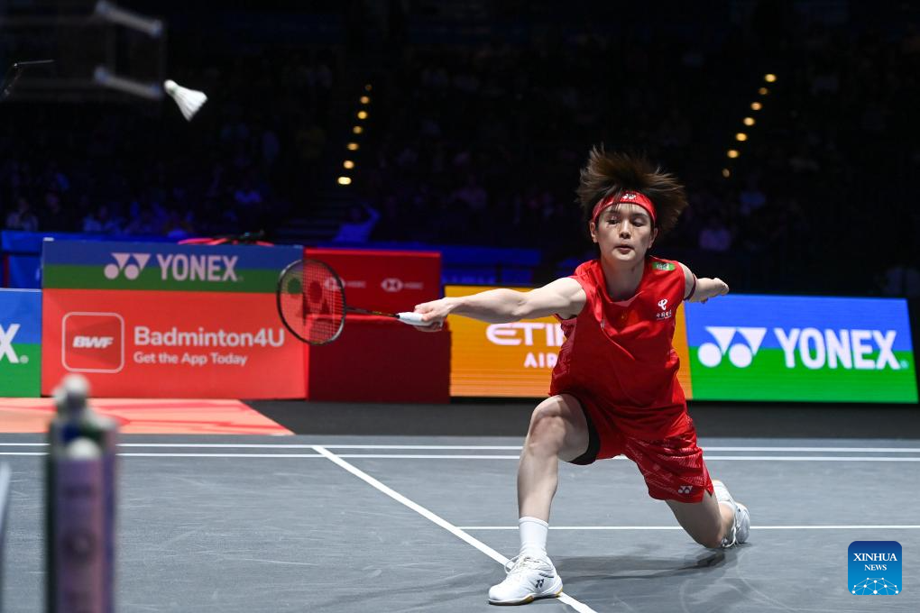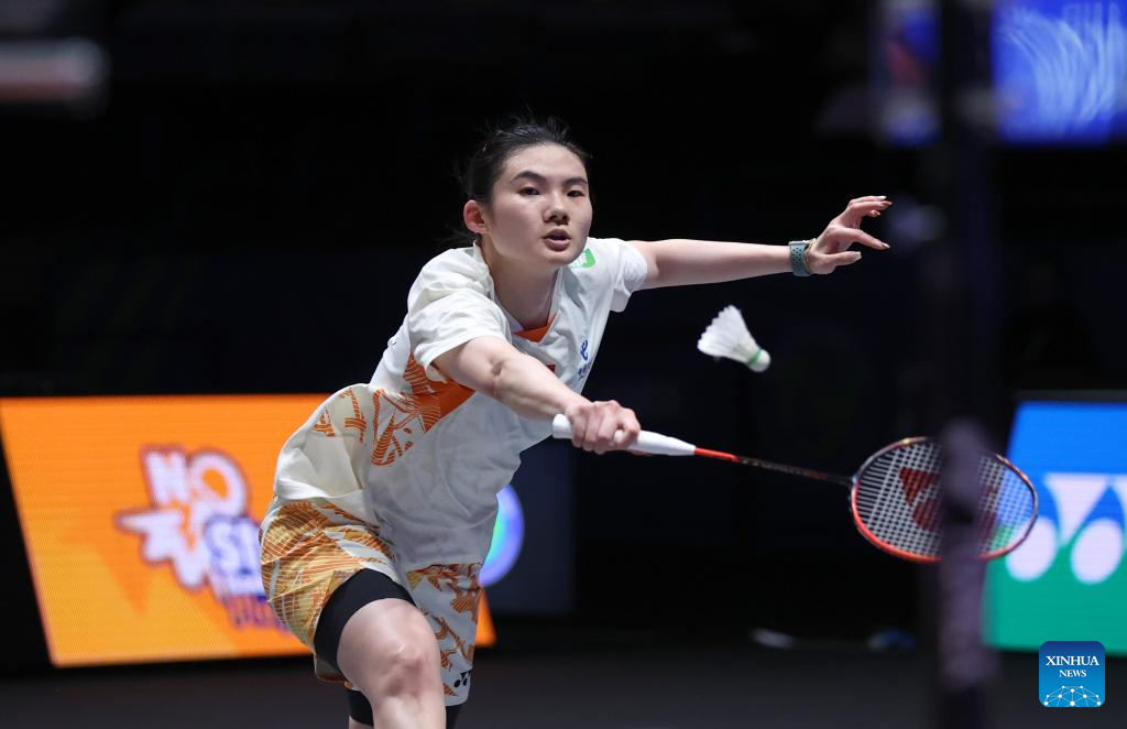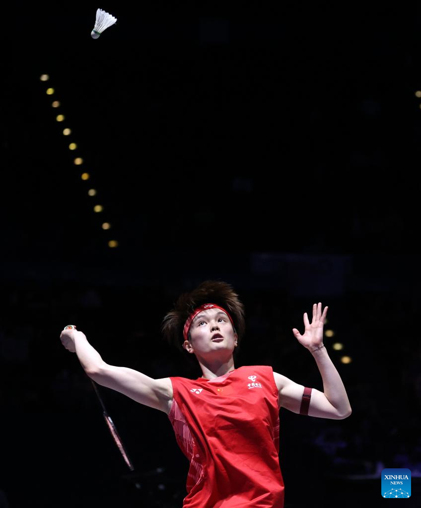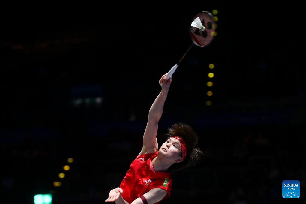 Wang Zhiyi hits a return during the women's singles semifinal between Wang Zhiyi of China and Han Yue of China at the All England Open Badminton Championships 2025 in Birmingham, Britain, March 15, 2025. (Xinhua/Li Ying)