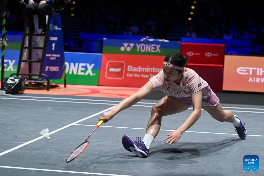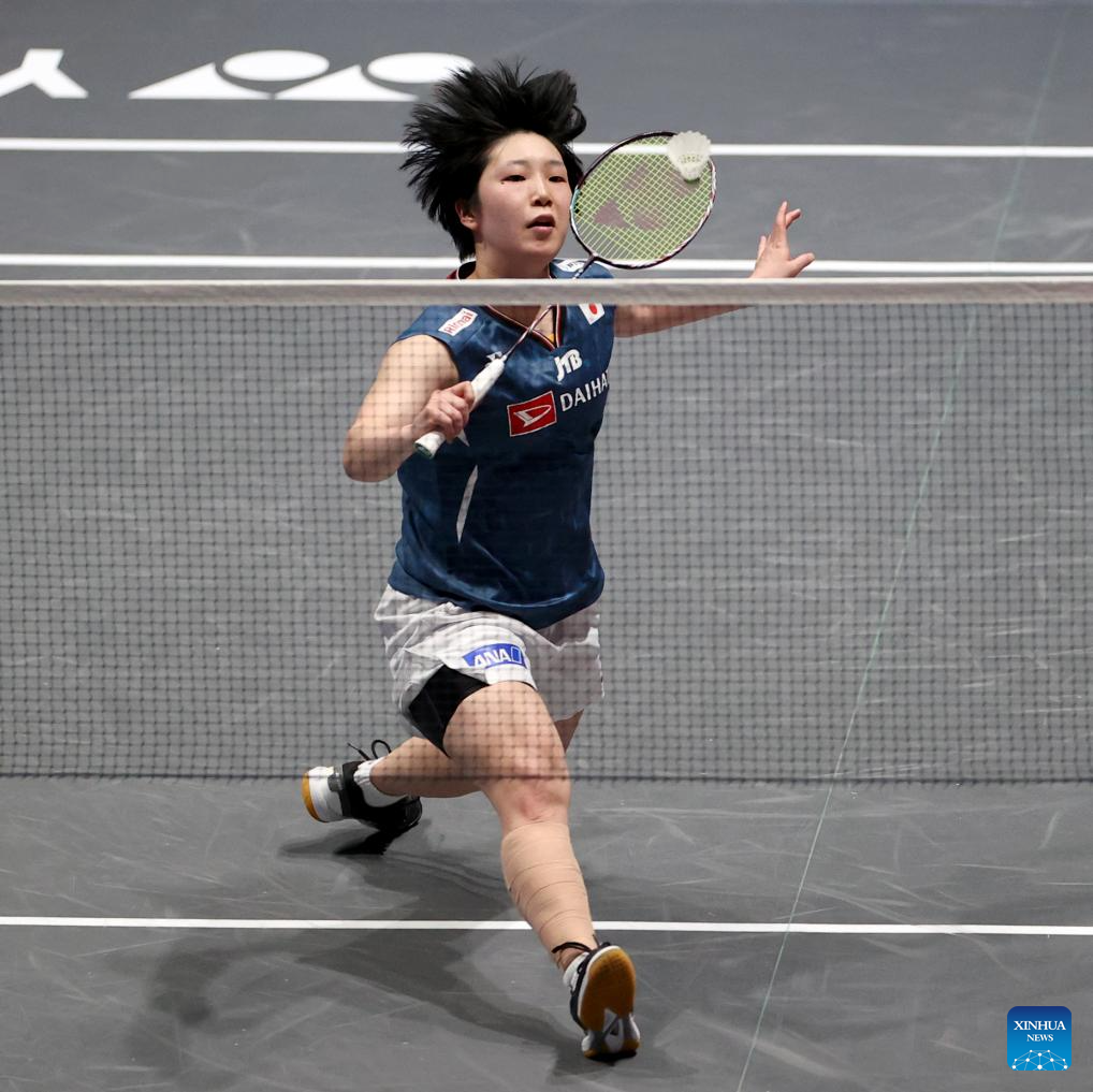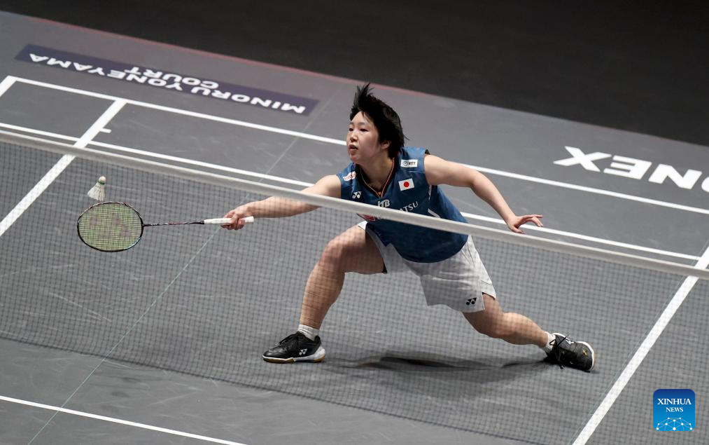 Yamaguchi Akane hits a return during the women's singles semifinal between An Se Young of South Korea and Yamaguchi Akane of Japan at the All England Open Badminton Championships 2025 in Birmingham, Britain, March 15, 2025. (Xinhua/Li Ying)