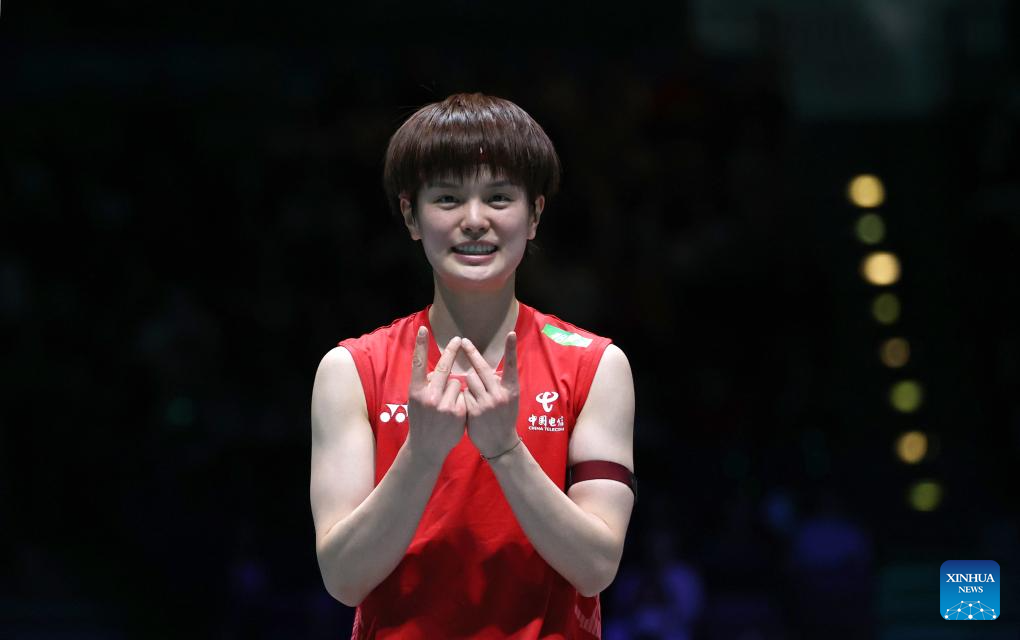 Wang Zhiyi celebrates after winning the women's singles semifinal between Wang Zhiyi of China and Han Yue of China at the All England Open Badminton Championships 2025 in Birmingham, Britain, March 15, 2025. (Xinhua/Wu Lu)