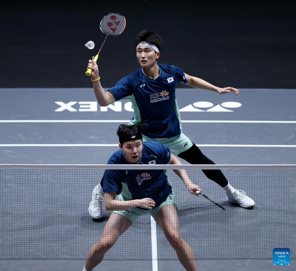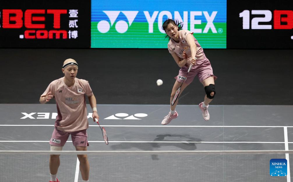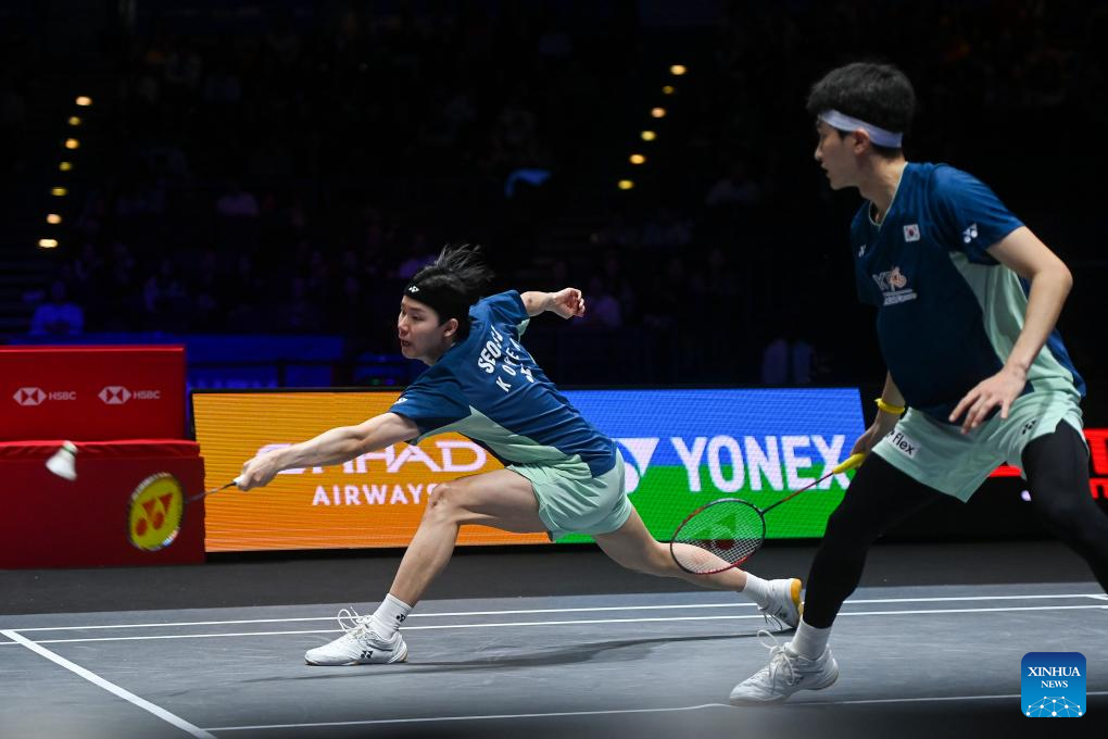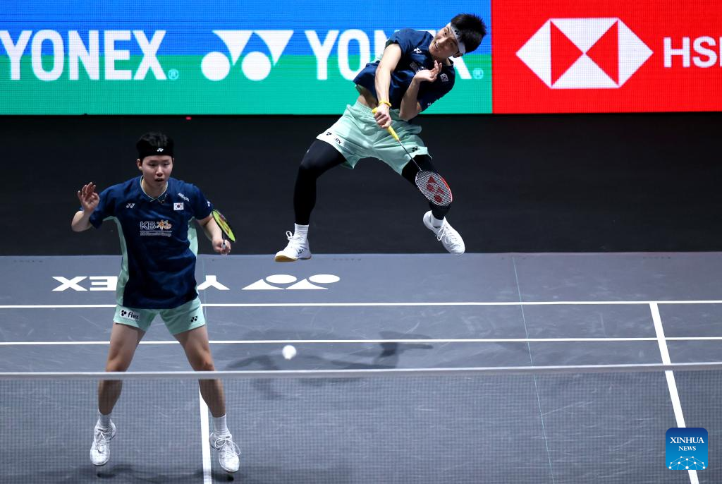 Lee Jong Min (L)/Chae Yu Jung compete during the mixed doubles semifinal between Feng Yanzhe/Wei Yaxin of China and Lee Jong Min/Chae Yu Jung of South Korea at the All England Open Badminton Championships 2025 in Birmingham, Britain, March 15, 2025. (Xinhua/Li Ying)