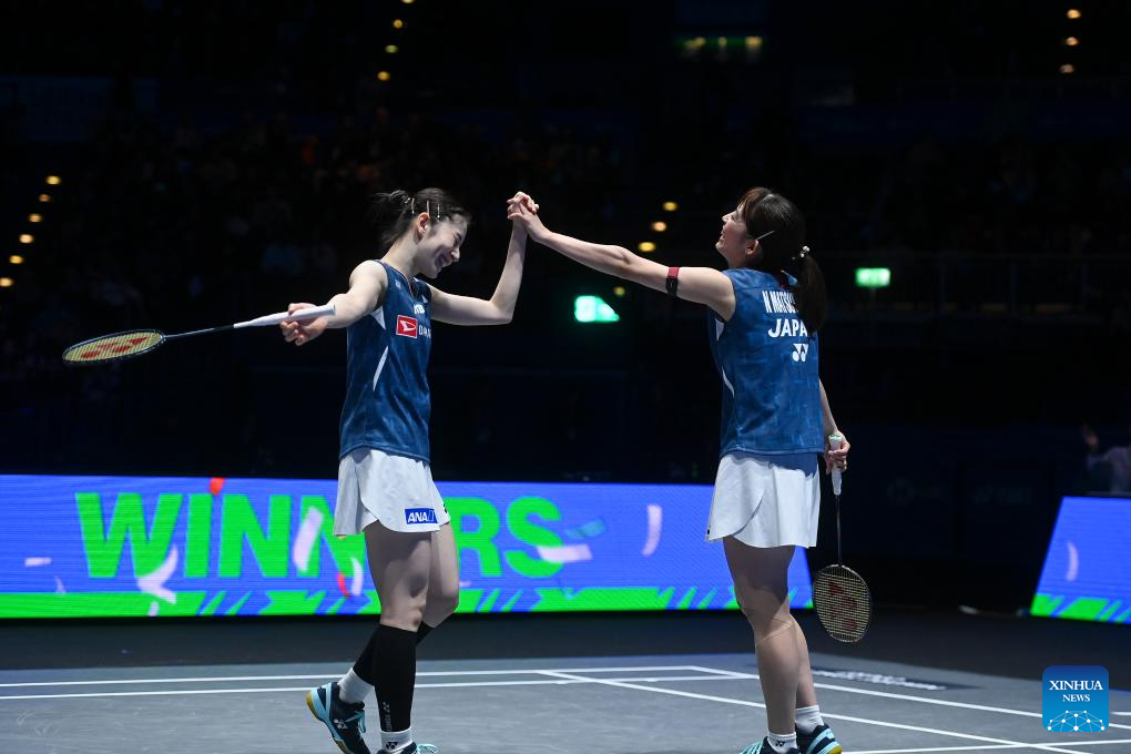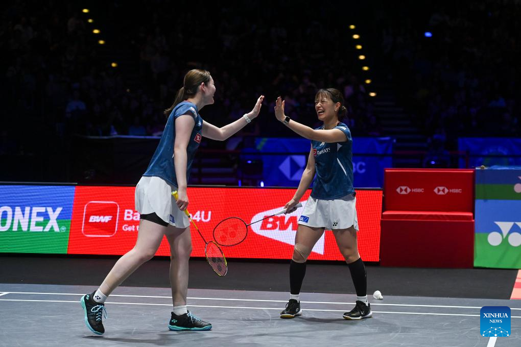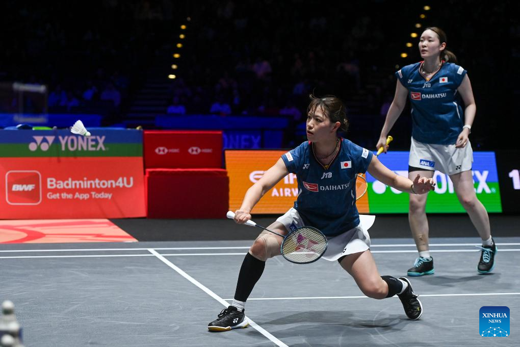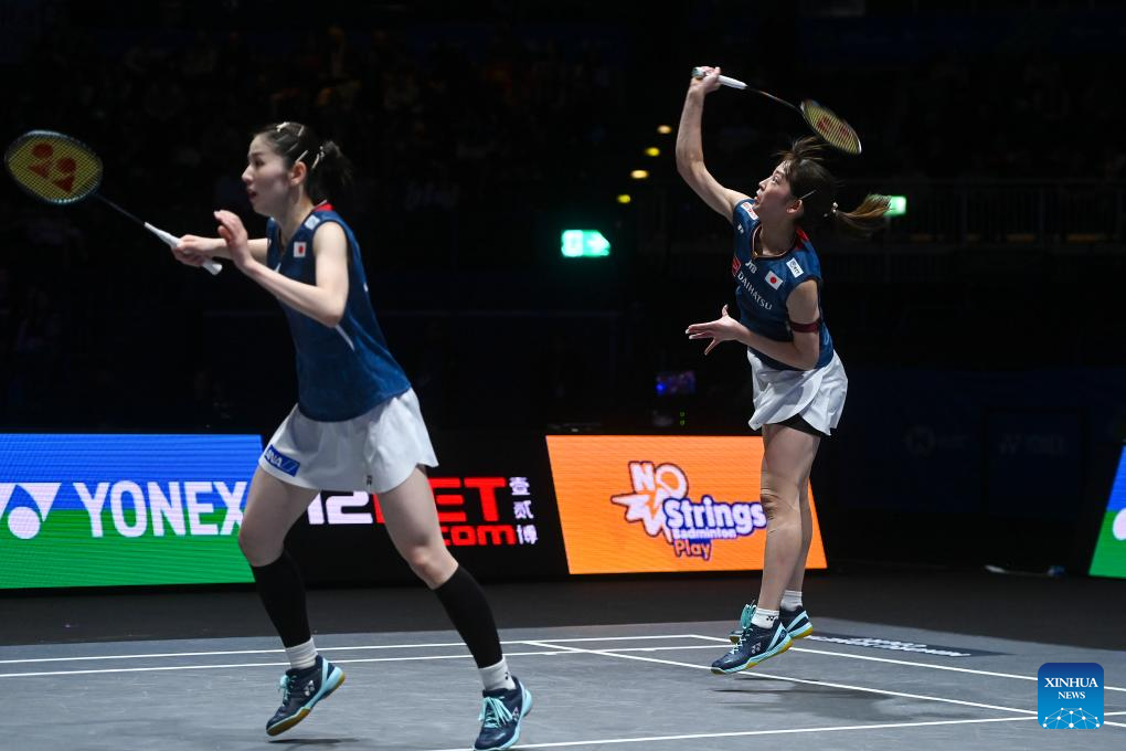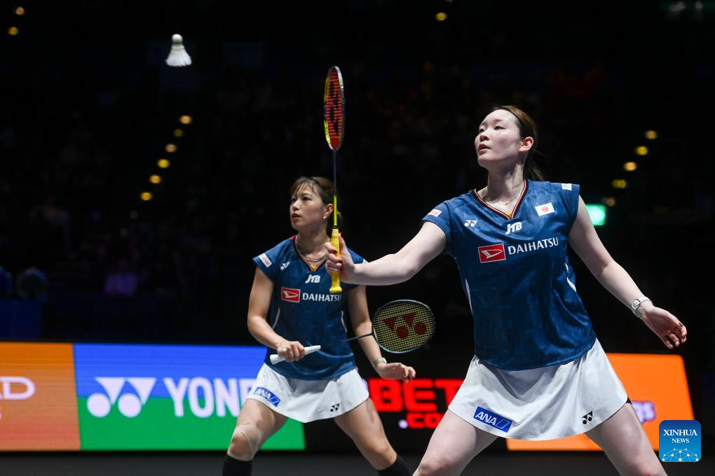 Matsuyama Nami (R)/Shida Chiharu compete during the women's doubles semifinal between Liu Shengshu/Tan Ning of China and Matsuyama Nami/Shida Chiharu of Japan at All England Open Badminton Championships 2025 in Birmingham, Britain, March 15, 2025. (Xinhua/Wu Lu)