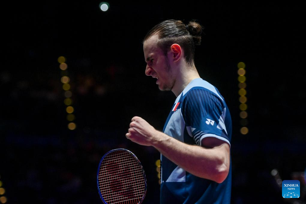 Alex Lanier reacts during the men's singles semifinal between Lee Chia Hao of Chinese Taipei and Alex Lanier of France at All England Open Badminton Championships 2025 in Birmingham, Britain, March 15, 2025. (Xinhua/Wu Lu)