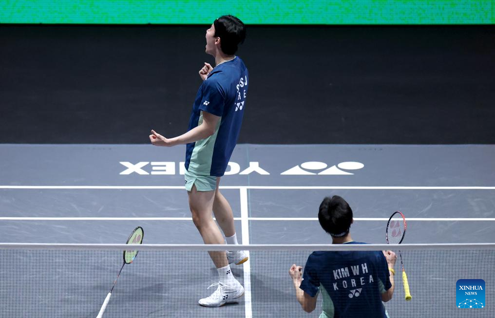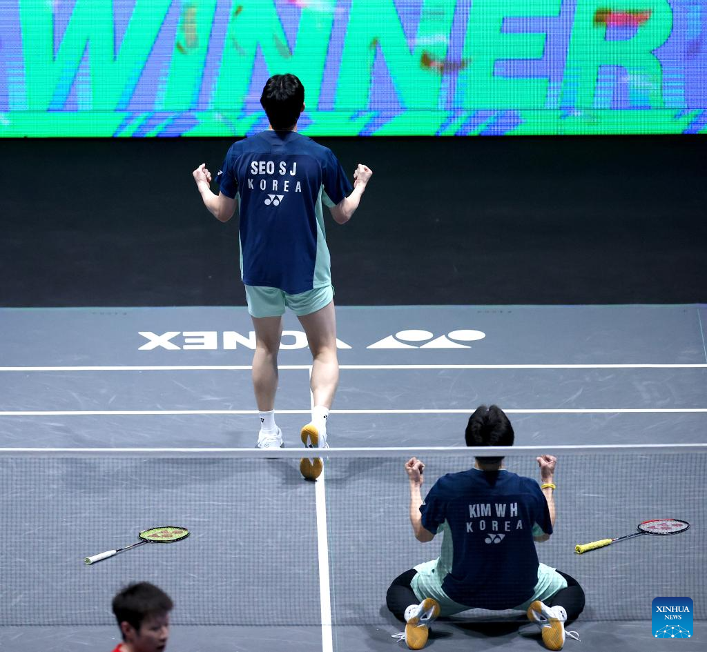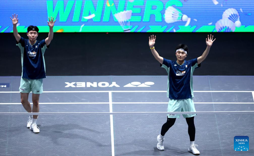 Kim Won Ho/Seo Seung Jae (L) celebrate after winning the men's doubles semifinal between He Jiting/Ren Xiangyu of China and Kim Won Ho/Seo Seung Jae of South Korea at the All England Open Badminton Championships 2025 in Birmingham, Britain, March 15, 2025. (Xinhua/Li Ying)