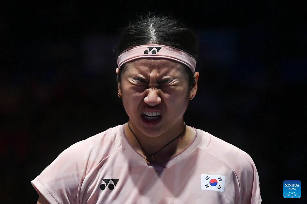 An Se Young reacts during the women's singles semifinal between An Se Young of South Korea and Yamaguchi Akane of Japan at the All England Open Badminton Championships 2025 in Birmingham, Britain, March 15, 2025. (Xinhua/Wu Lu)