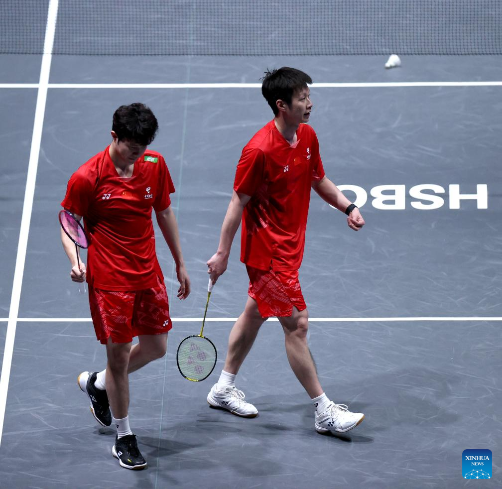 He Jiting/Ren Xiangyu (R) react during the men's doubles semifinal between He Jiting/Ren Xiangyu of China and Kim Won Ho/Seo Seung Jae of South Korea at the All England Open Badminton Championships 2025 in Birmingham, Britain, March 15, 2025. (Xinhua/Li Ying)
