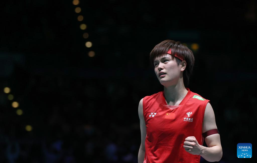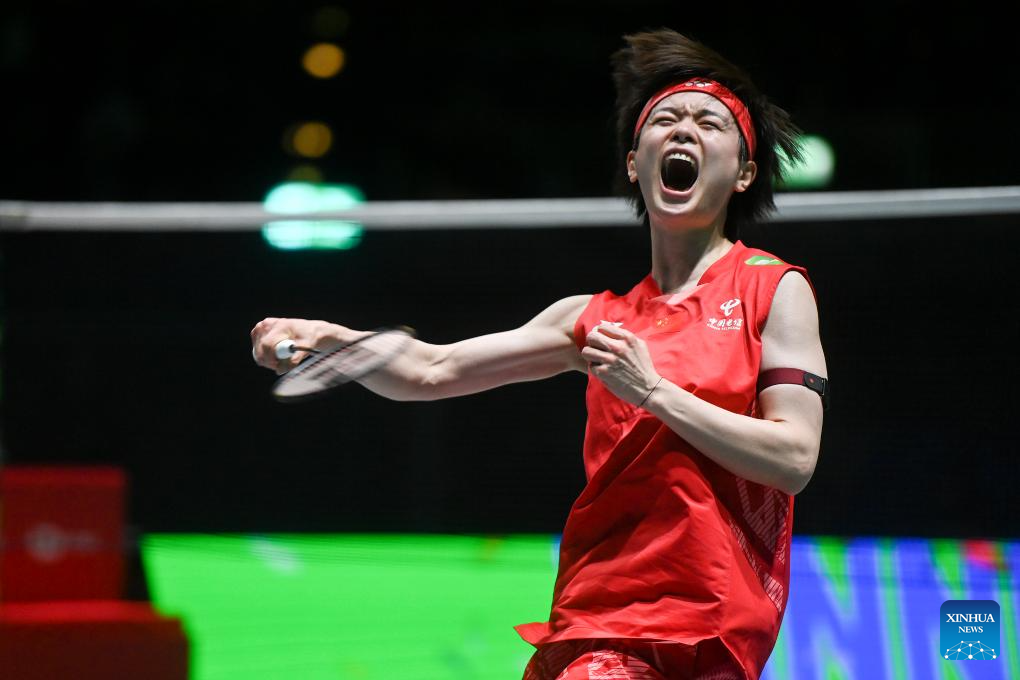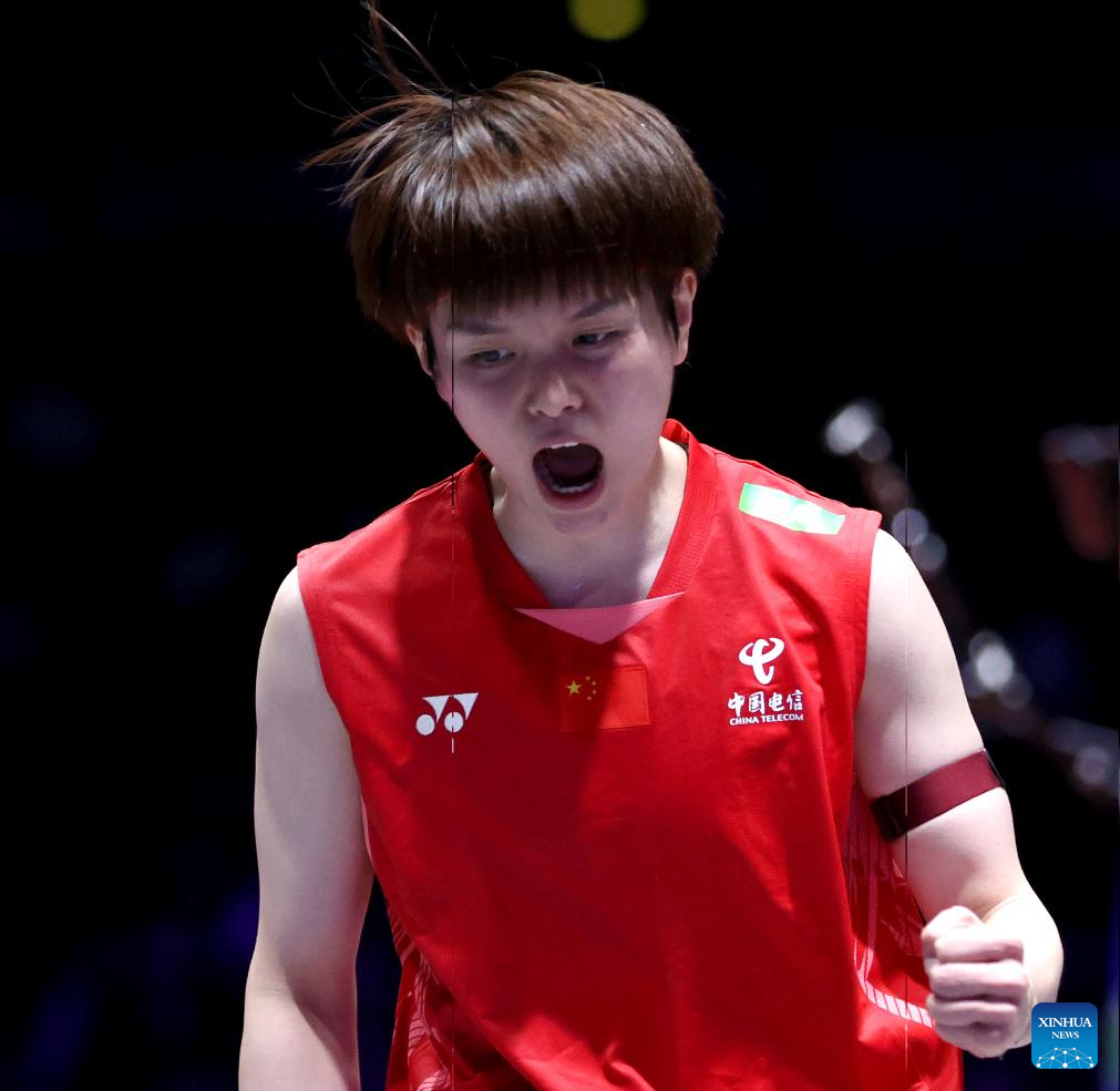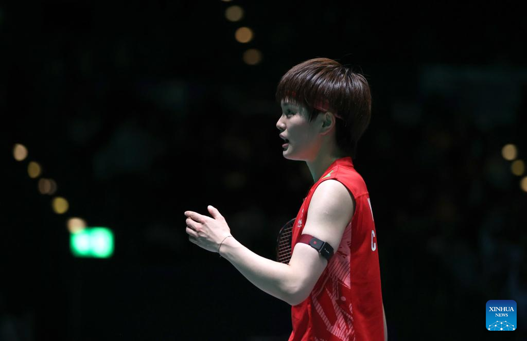 Wang Zhiyi celebrates scoring during the women's singles semifinal between Wang Zhiyi of China and Han Yue of China at the All England Open Badminton Championships 2025 in Birmingham, Britain, March 15, 2025. (Xinhua/Li Ying)