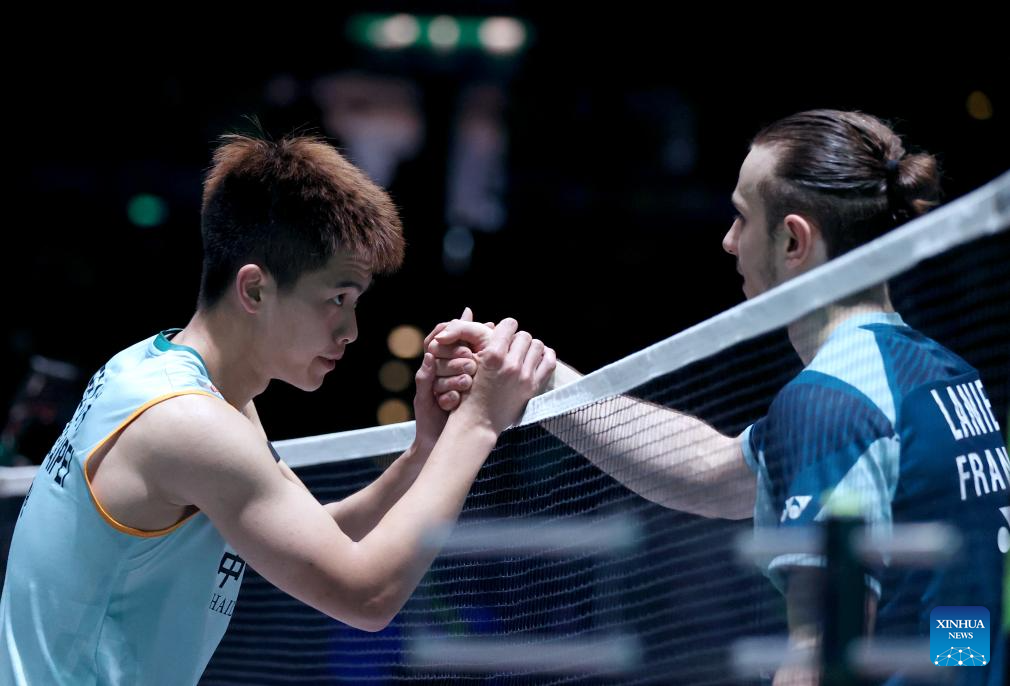 Lee Chia Hao (L) of Chinese Taipei greets Alex Lanier of France after their men's singles semifinal at All England Open Badminton Championships 2025 in Birmingham, Britain, March 15, 2025. (Xinhua/Li Ying)