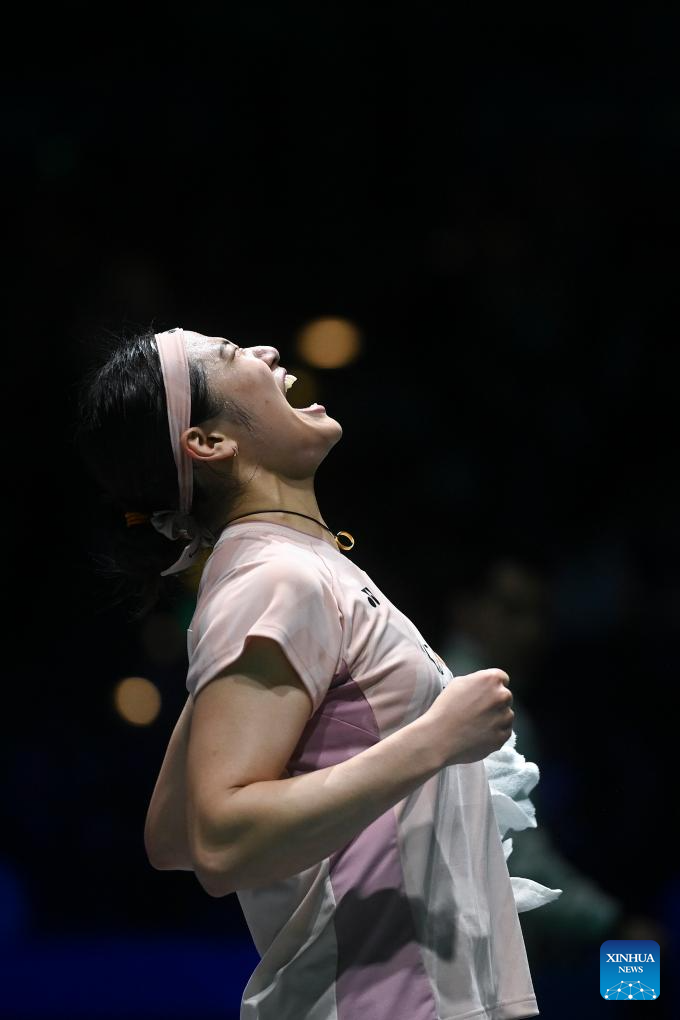 Wang Zhiyi celebrates after winning the women's singles semifinal between Wang Zhiyi of China and Han Yue of China at the All England Open Badminton Championships 2025 in Birmingham, Britain, March 15, 2025. (Xinhua/Li Ying)