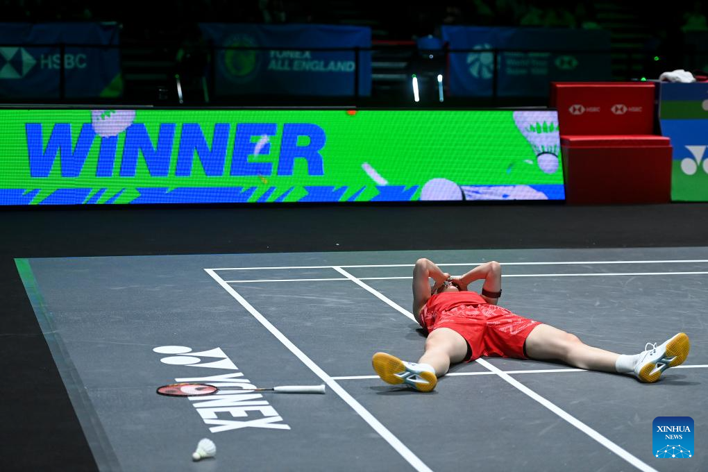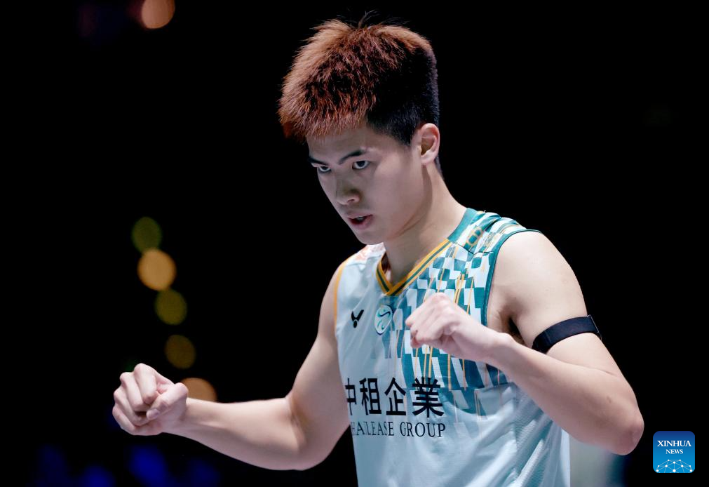 Shi Yuqi celebrates winning the men's singles semifinal between Shi Yuqi of China and Li Shifeng of China at All England Open Badminton Championships 2025 in Birmingham, Britain, March 15, 2025. (Xinhua/Wu Lu)