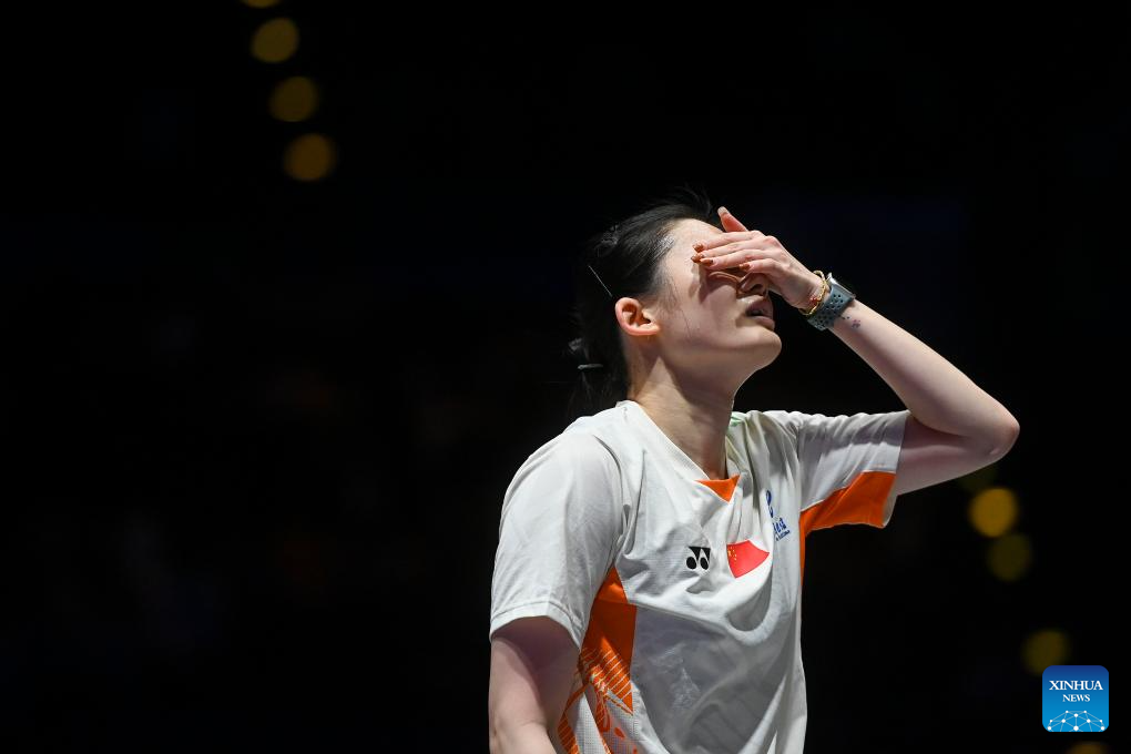 Han Yue reacts during the women's singles semifinal between Wang Zhiyi of China and Han Yue of China at the All England Open Badminton Championships 2025 in Birmingham, Britain, March 15, 2025. (Xinhua/Wu Lu)