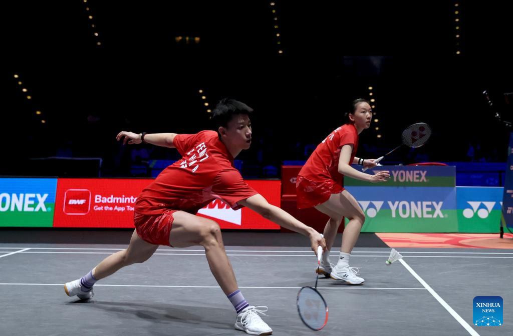 Feng Yanzhe/Wei Yaxin (front) compete during the mixed doubles semifinal between Feng Yanzhe/Wei Yaxin of China and Lee Jong Min/Chae Yu Jung of South Korea at the All England Open Badminton Championships 2025 in Birmingham, Britain, March 15, 2025. (Xinhua/Li Ying)