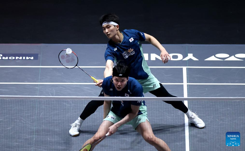Kim Won Ho/Seo Seung Jae (L) compete during the men's doubles semifinal between He Jiting/Ren Xiangyu of China and Kim Won Ho/Seo Seung Jae of South Korea at the All England Open Badminton Championships 2025 in Birmingham, Britain, March 15, 2025. (Xinhua/Wu Lu)