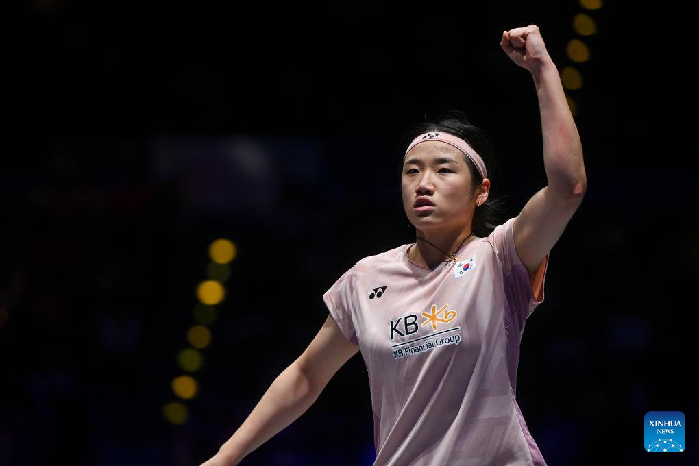 An Se Young celebrates scoring during the women's singles semifinal between An Se Young of South Korea and Yamaguchi Akane of Japan at the All England Open Badminton Championships 2025 in Birmingham, Britain, March 15, 2025. (Xinhua/Wu Lu)