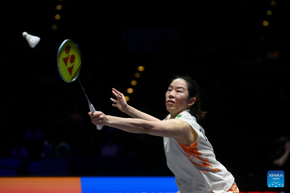 Wang Zhiyi hits a return during the women's singles semifinal between Wang Zhiyi of China and Han Yue of China at the All England Open Badminton Championships 2025 in Birmingham, Britain, March 15, 2025. (Xinhua/Wu Lu)