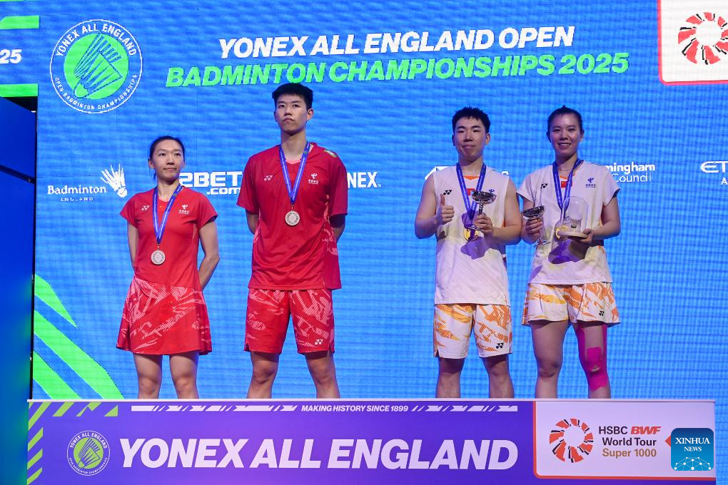 Wei Yaxin, Feng Yanzhe and GuoXinwa, Chen Fanghui (From L to R) of China pose for photos during the awarding ceremony after the mixed doubles final between GuoXinwa/Chen Fanghui of China and Feng Yanzhe/Wei Yaxin of China at the All England Open Badminton Championships 2025 in Birmingham, Britain, March 16, 2025. (Xinhua/Wu Lu)
