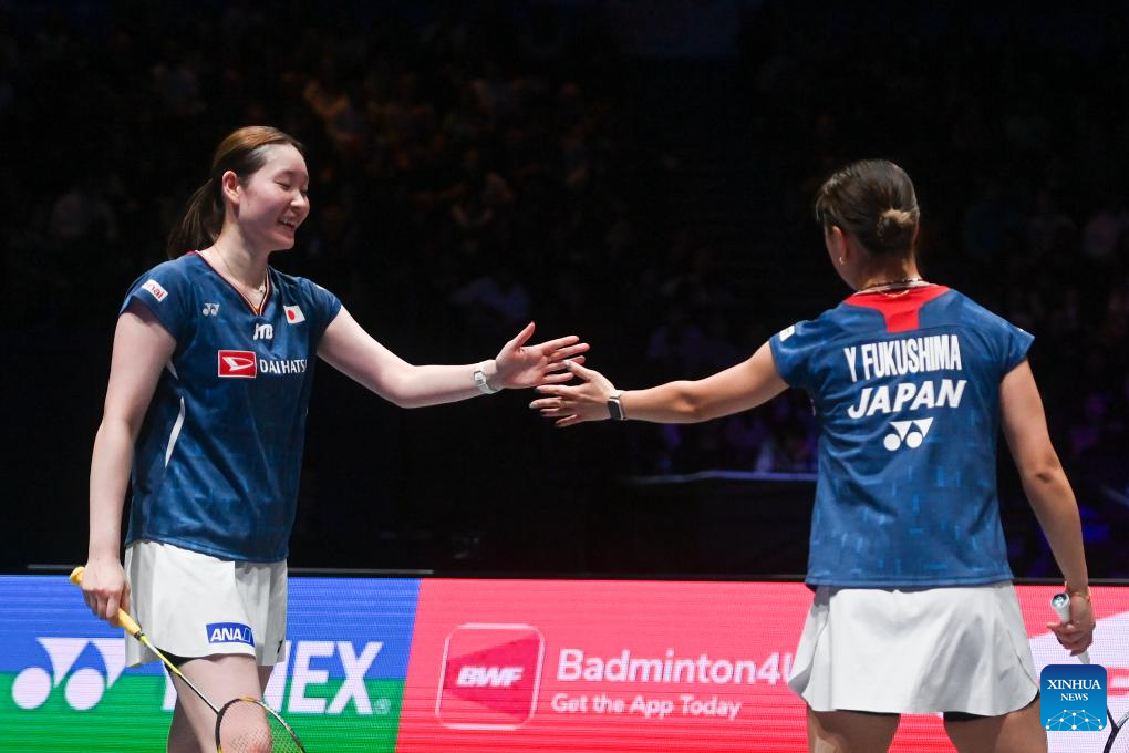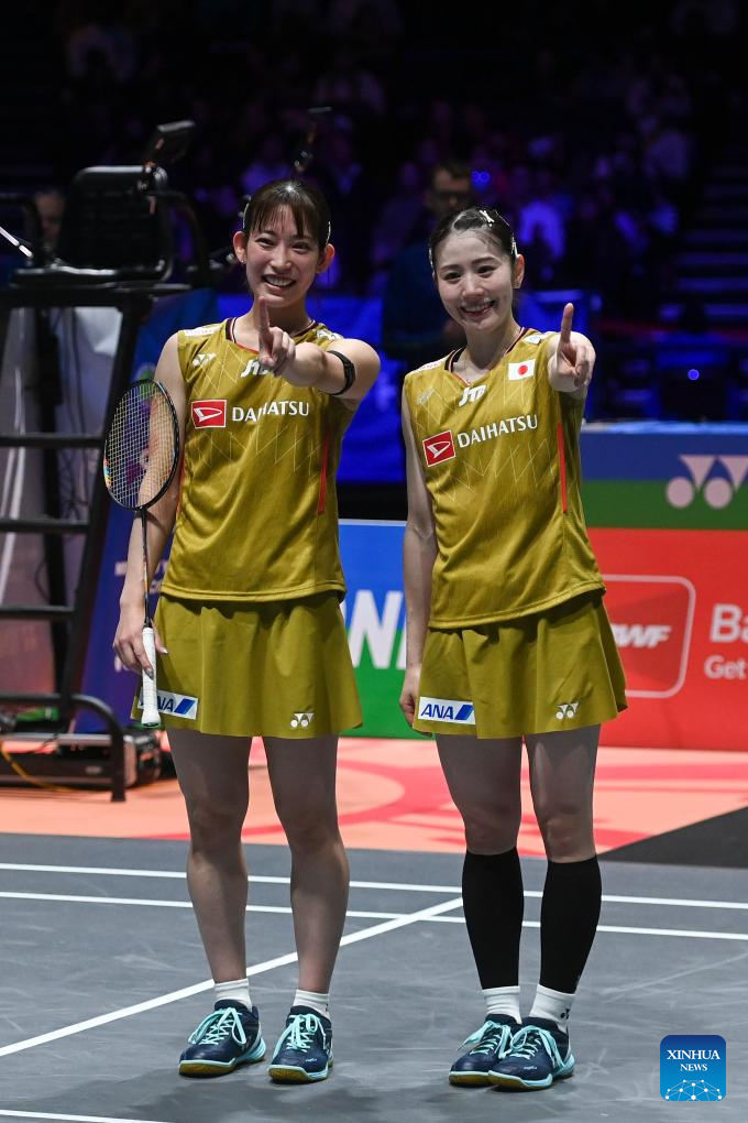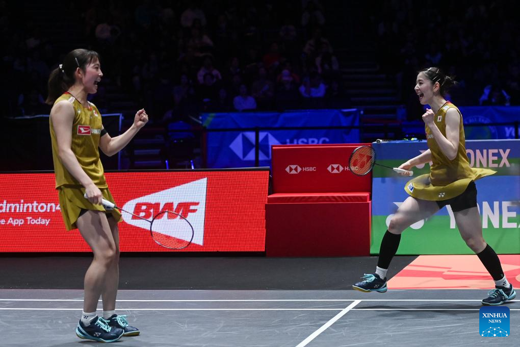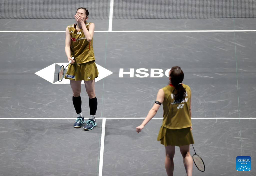 Matsuyama Nami/Shida Chiharu (L) celebrate during the women's doubles final between Matsuyama Nami/Shida Chiharu of Japan and Fukushima Yuki/Matsumoto Mayu of Japan at the All England Open Badminton Championships 2025 in Birmingham, Britain, March 16, 2025. (Xinhua/Li Ying)