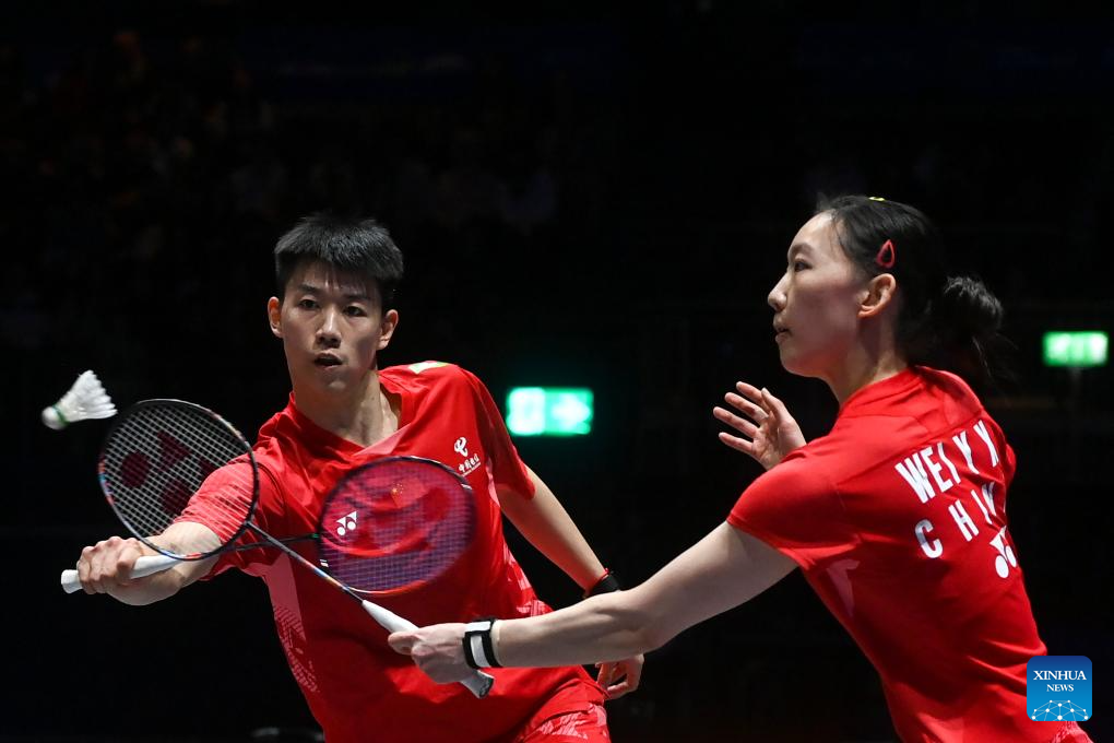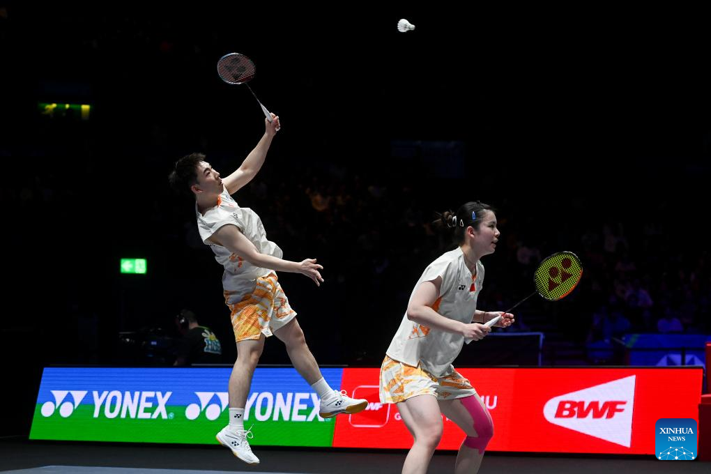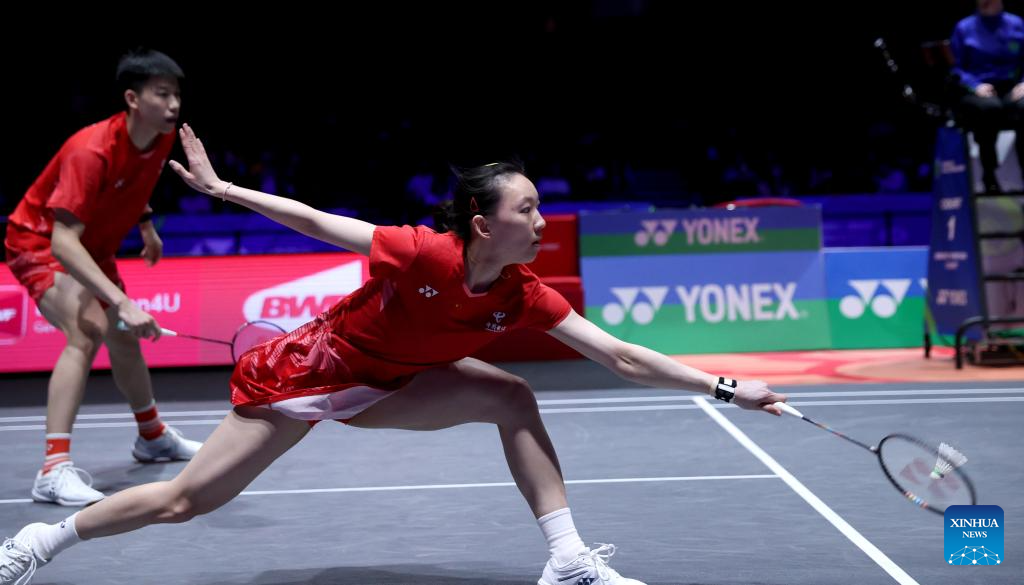 Feng Yanzhe/Wei Yaxin (L) compete during the mixed doubles final between GuoXinwa/Chen Fanghui of China and Feng Yanzhe/Wei Yaxin of China at the All England Open Badminton Championships 2025 in Birmingham, Britain, March 16, 2025. (Xinhua/Wu Lu)