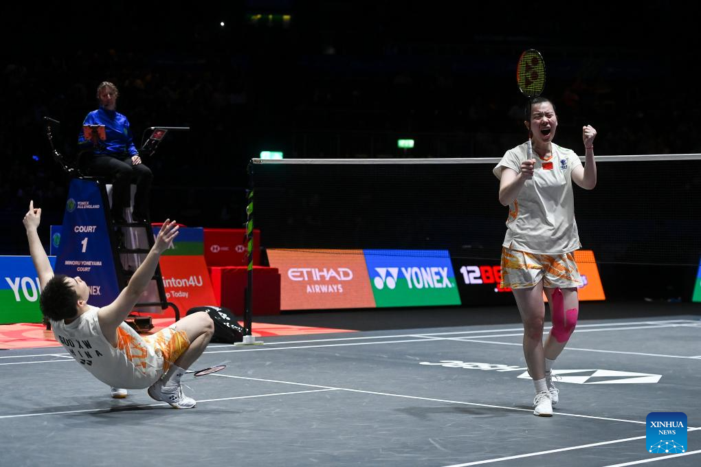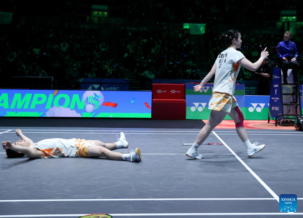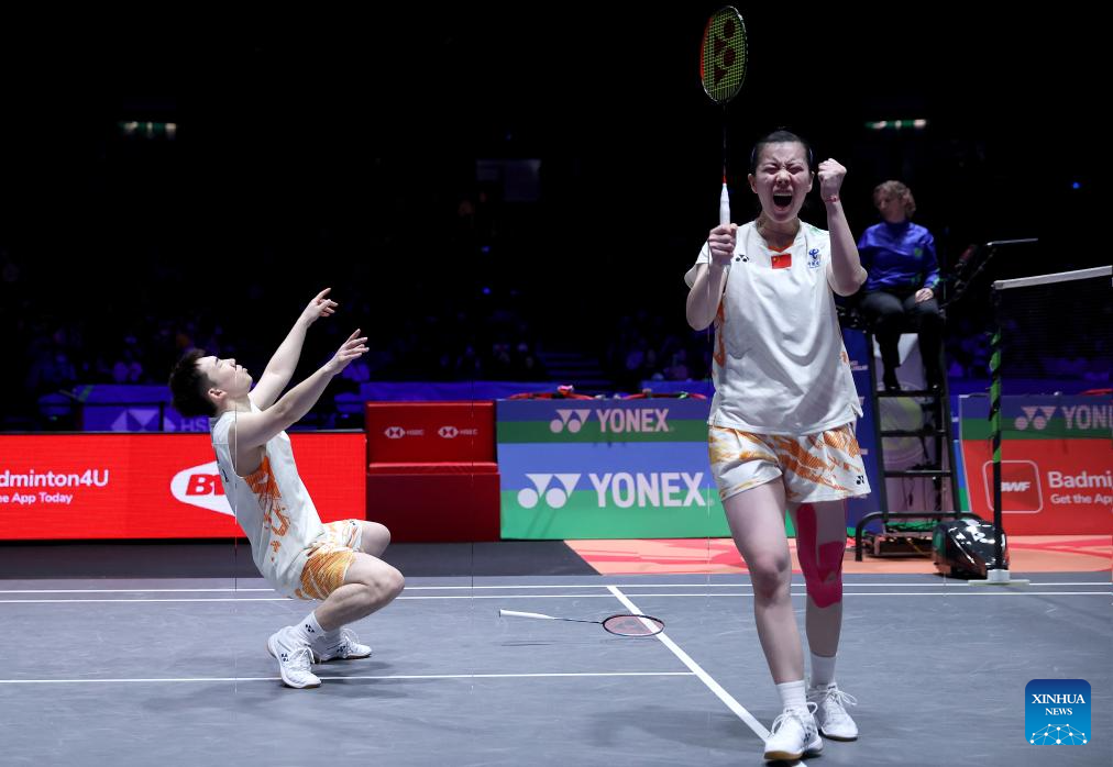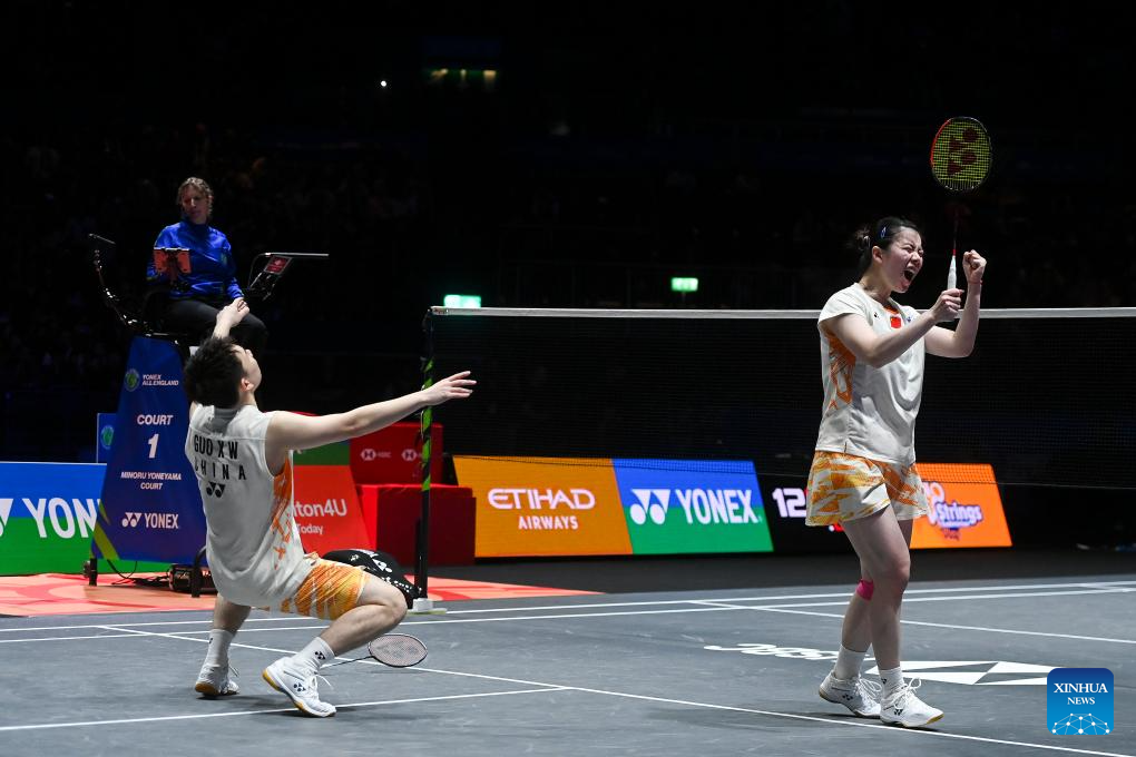 GuoXinwa/Chen Fanghui (R) celebrate after the mixed doubles final between GuoXinwa/Chen Fanghui of China and Feng Yanzhe/Wei Yaxin of China at the All England Open Badminton Championships 2025 in Birmingham, Britain, March 16, 2025. (Xinhua/Li Ying)