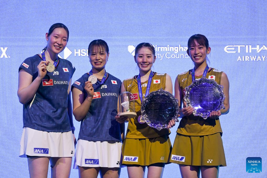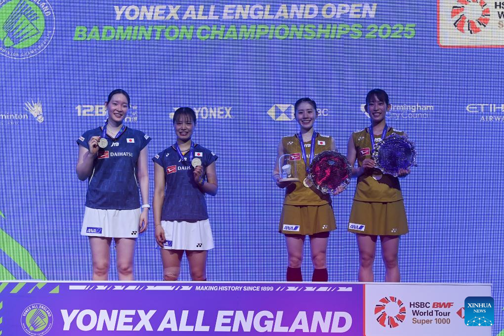 Winners Matsuyama Nami (1st R)/Shida Chiharu (2nd R), runners-up Matsumoto Mayu (1st L)/Fukushima Yuki pose for a group photo during the awarding ceremony of the women's doubles final between Matsuyama Nami/Shida Chiharu of Japan and Fukushima Yuki/Matsumoto Mayu of Japan at the All England Open Badminton Championships 2025 in Birmingham, Britain, March 16, 2025. (Xinhua/Wu Lu)