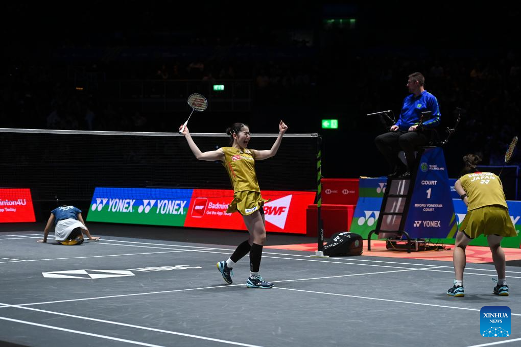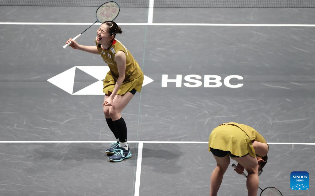 Shida Chiharu (L)/Matsuyama Nami celebrate after winning the women's doubles final between Matsuyama Nami/Shida Chiharu of Japan and Fukushima Yuki/Matsumoto Mayu of Japan at the All England Open Badminton Championships 2025 in Birmingham, Britain, March 16, 2025. (Xinhua/Wu Lu)