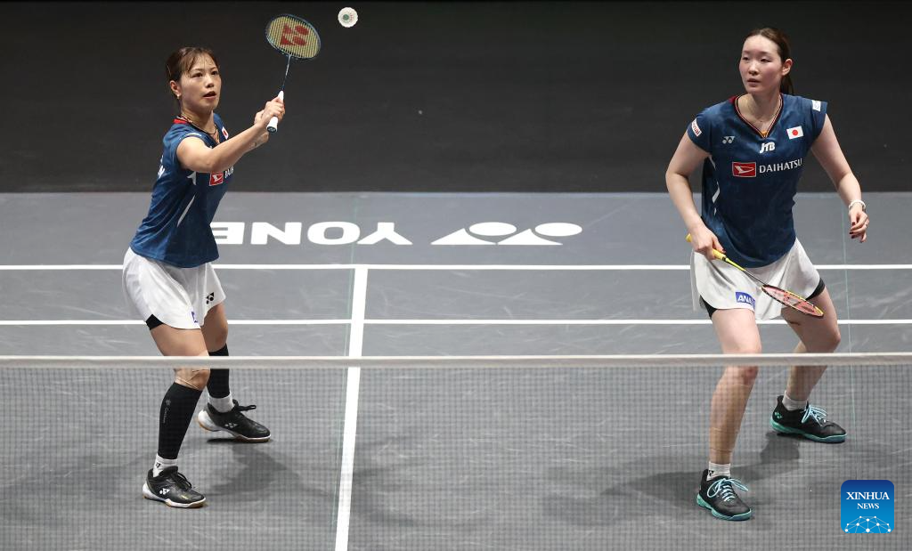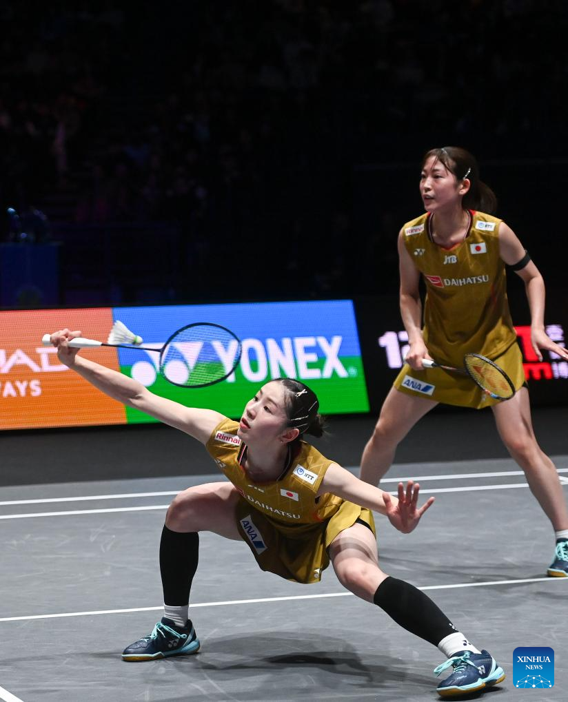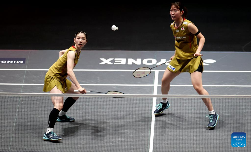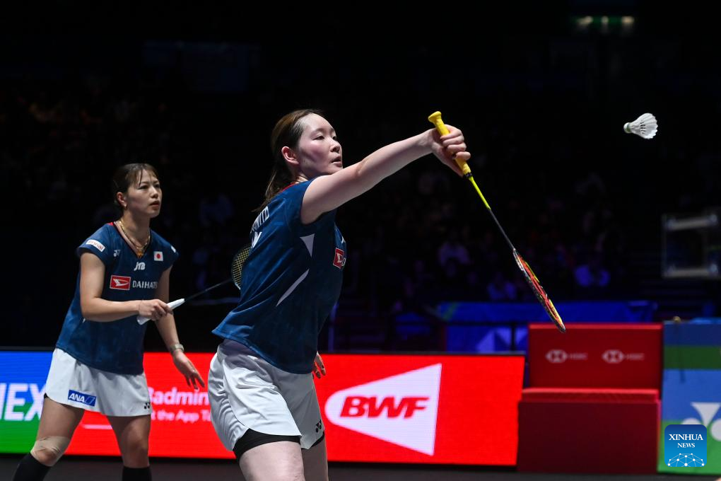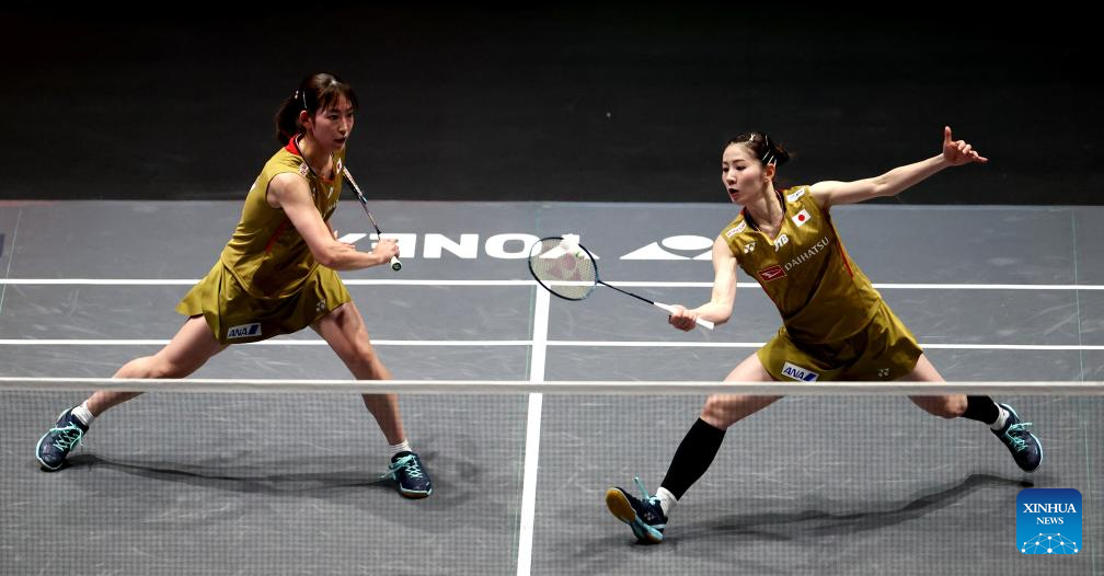 Matsuyama Nami/Shida Chiharu (L) compete during the women's doubles final between Matsuyama Nami/Shida Chiharu of Japan and Fukushima Yuki/Matsumoto Mayu of Japan at the All England Open Badminton Championships 2025 in Birmingham, Britain, March 16, 2025. (Xinhua/Li Ying)