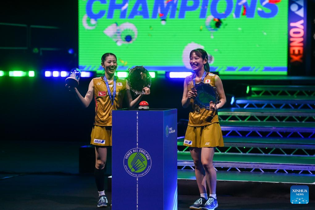 Shida Chiharu (L)/Matsuyama Nami celebrate during the awarding ceremony of the women's doubles final between Matsuyama Nami/Shida Chiharu of Japan and Fukushima Yuki/Matsumoto Mayu of Japan at the All England Open Badminton Championships 2025 in Birmingham, Britain, March 16, 2025. (Xinhua/Wu Lu)