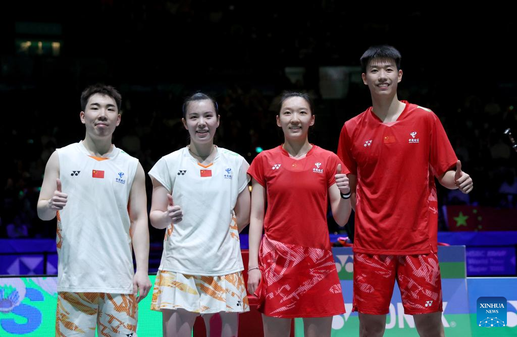 GuoXinwa, Chen Fanghui, Wei Yaxin and Feng Yanzhe (From L to R) of China pose for photos after the mixed doubles final between GuoXinwa/Chen Fanghui of China and Feng Yanzhe/Wei Yaxin of China at the All England Open Badminton Championships 2025 in Birmingham, Britain, March 16, 2025. (Xinhua/Li Ying)