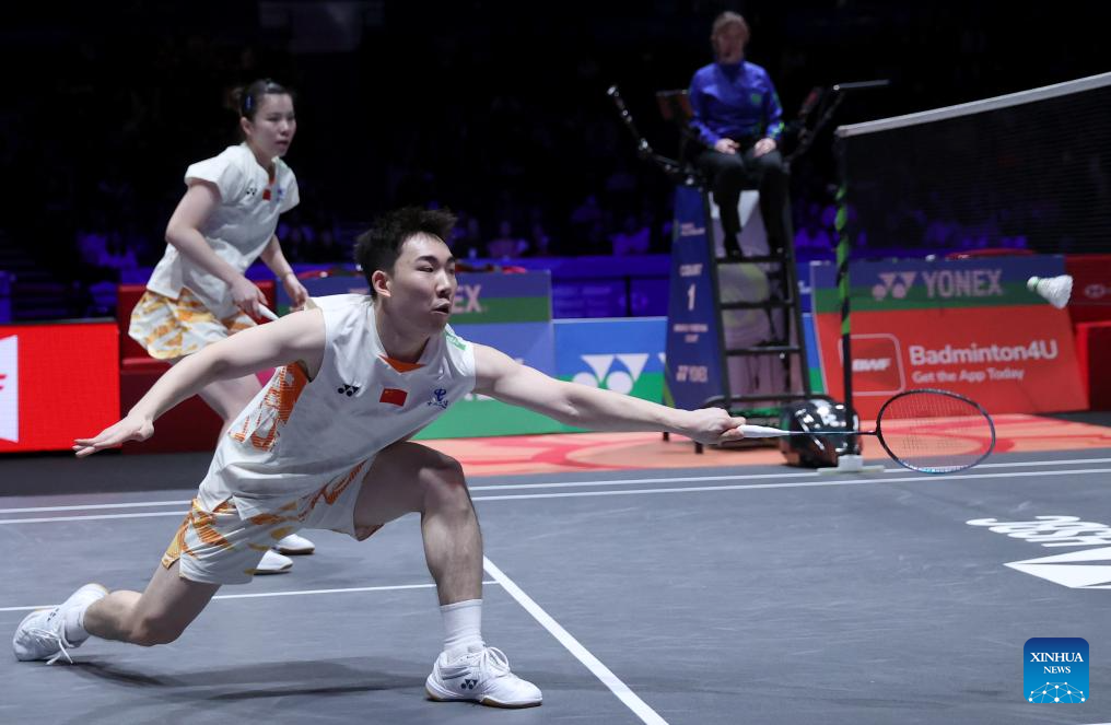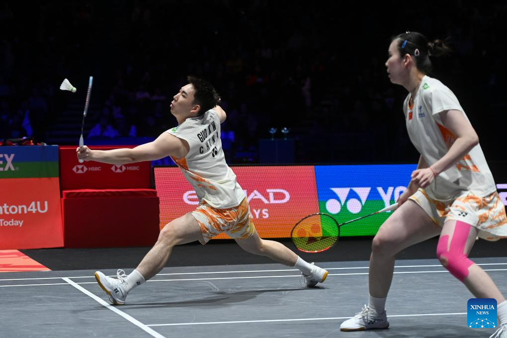 GuoXinwa/Chen Fanghui (R) ccompete during the mixed doubles final between GuoXinwa/Chen Fanghui of China and Feng Yanzhe/Wei Yaxin of China at the All England Open Badminton Championships 2025 in Birmingham, Britain, March 16, 2025. (Xinhua/Wu Lu)