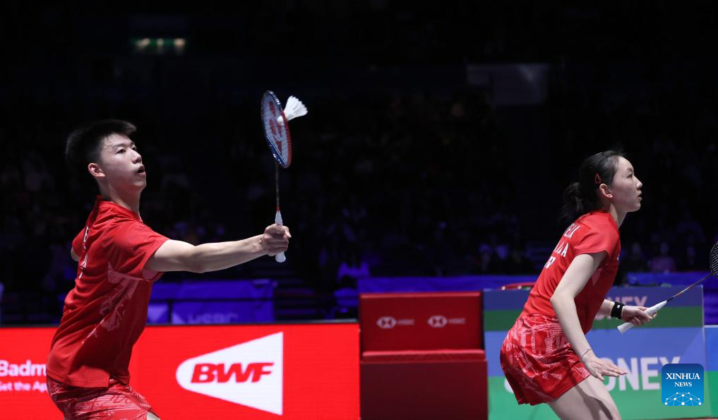 GuoXinwa (L)/Chen Fanghui compete during the mixed doubles final between GuoXinwa/Chen Fanghui of China and Feng Yanzhe/Wei Yaxin of China at the All England Open Badminton Championships 2025 in Birmingham, Britain, March 16, 2025. (Xinhua/Wu Lu)