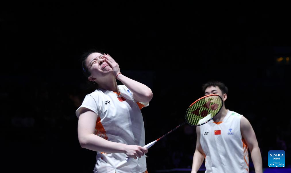 GuoXinwa /Chen Fanghui (L) react during the mixed doubles final between GuoXinwa/Chen Fanghui of China and Feng Yanzhe/Wei Yaxin of China at the All England Open Badminton Championships 2025 in Birmingham, Britain, March 16, 2025. (Xinhua/Li Ying)