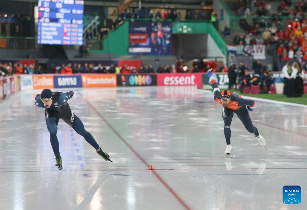 Jordan Stolz (L) of the United States and Kjeld Nuis of the Netherlands compete during the men's 1500m at the ISU World Speed Skating Single Distances Championships in Hamar, Norway, March 16, 2025. (Xinhua/Zhang Yuliang)
