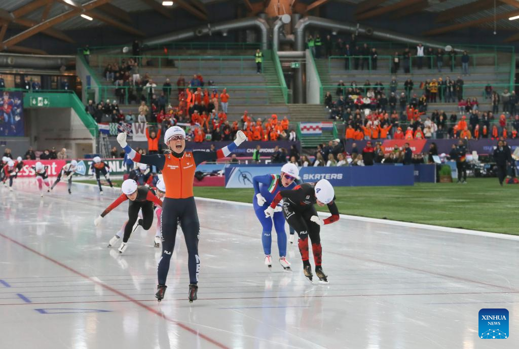 Marijke Groenewoud (Front) of the Netherlands celebrates after crossing the finish line during the women's mass start at the ISU World Speed Skating Single Distances Championships in Hamar, Norway, March 16, 2025. (Xinhua/Zhang Yuliang)