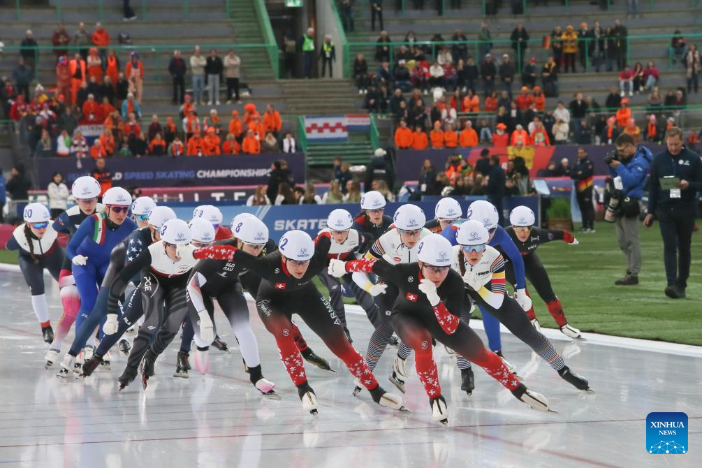 Athletes compete during the women's mass start at the ISU World Speed Skating Single Distances Championships in Hamar, Norway, March 16, 2025. (Xinhua/Zhang Yuliang)