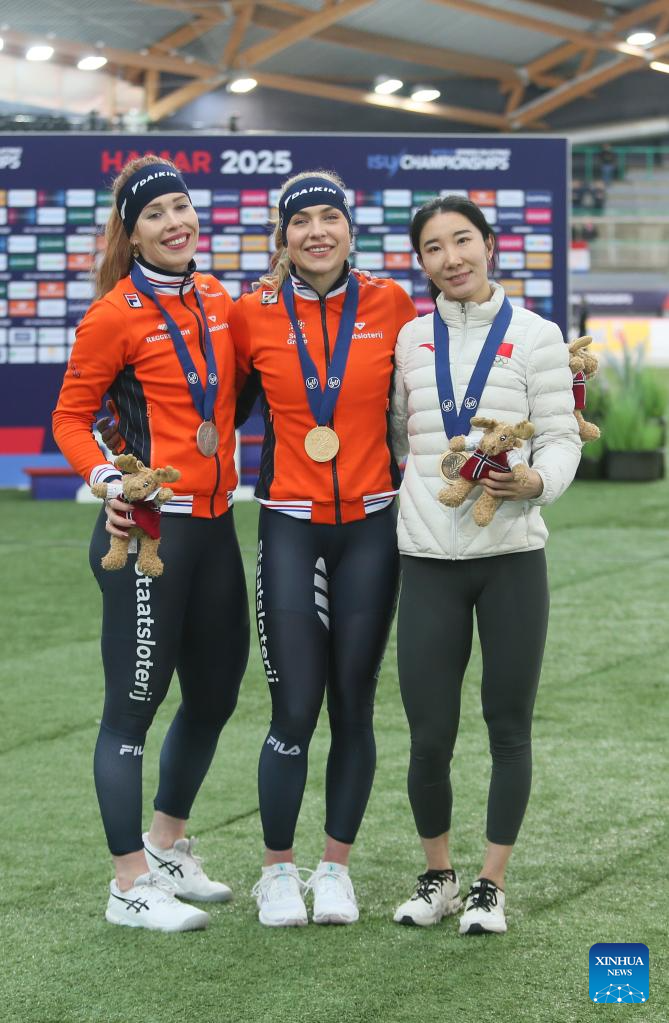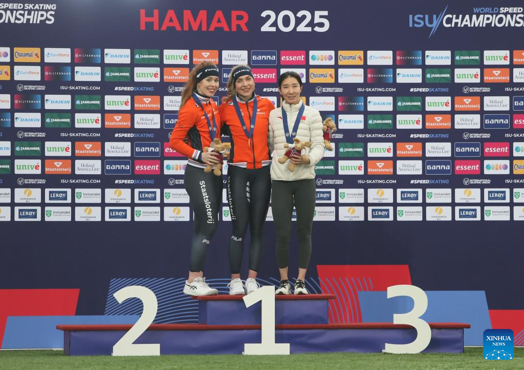 Gold medalist Joy Beune (C) of the Netherlands, silver medalist Antoinette Rijpma-De Jong (L) of the Netherlands, bronze medalist Han Mei of China pose during the awarding ceremony for the women's 1500m at the ISU World Speed Skating Single Distances Championships in Hamar, Norway, March 16, 2025. (Xinhua/Zhang Yuliang)