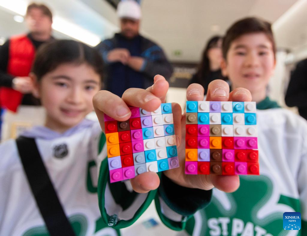 Children take part in a LEGO Mural Building event in Toronto, Canada, on March 17, 2025. LEGO Canada invited people to build a hockey-themed LEGO mural with 41,472 LEGO bricks here on Monday. (Photo by Zou Zheng/Xinhua)