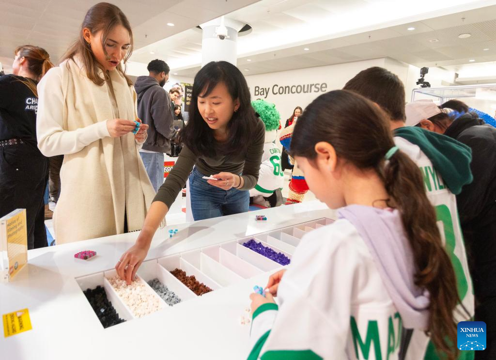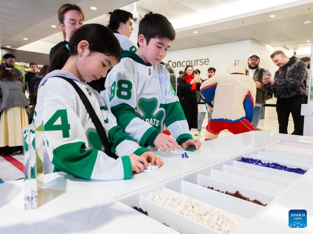 People take part in a LEGO Mural Building event in Toronto, Canada, on March 17, 2025. LEGO Canada invited people to build a hockey-themed LEGO mural with 41,472 LEGO bricks here on Monday. (Photo by Zou Zheng/Xinhua)