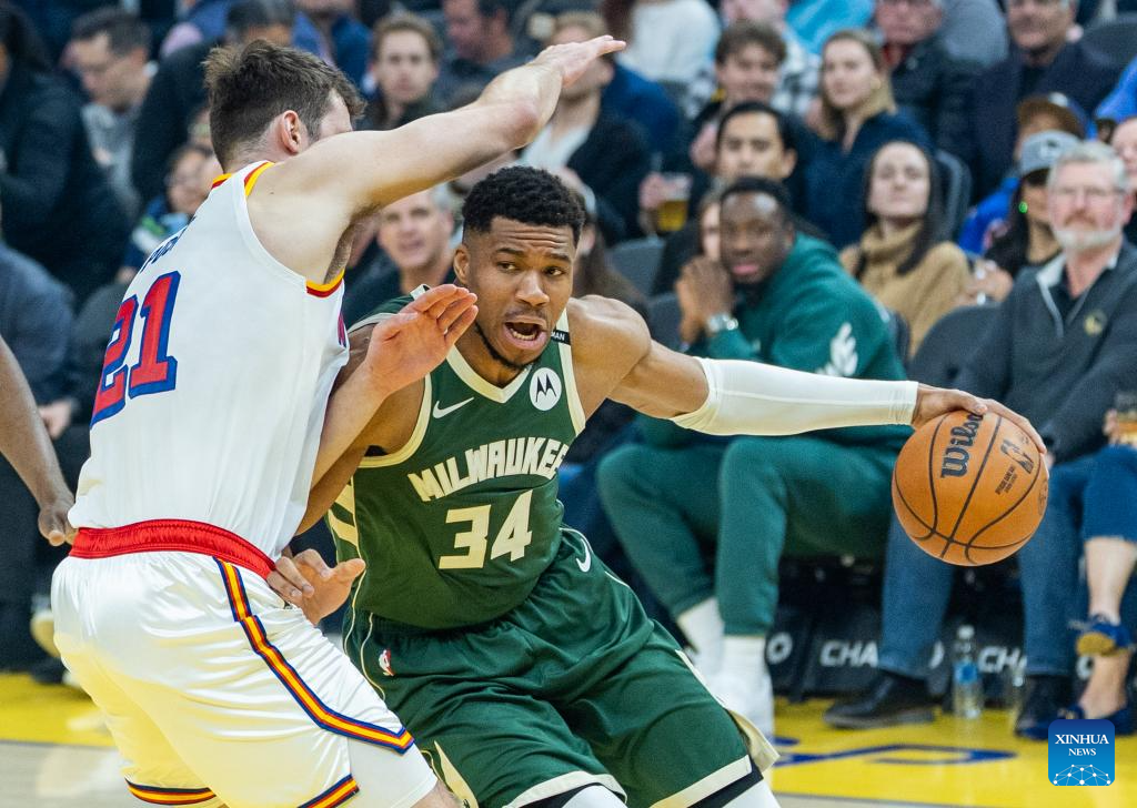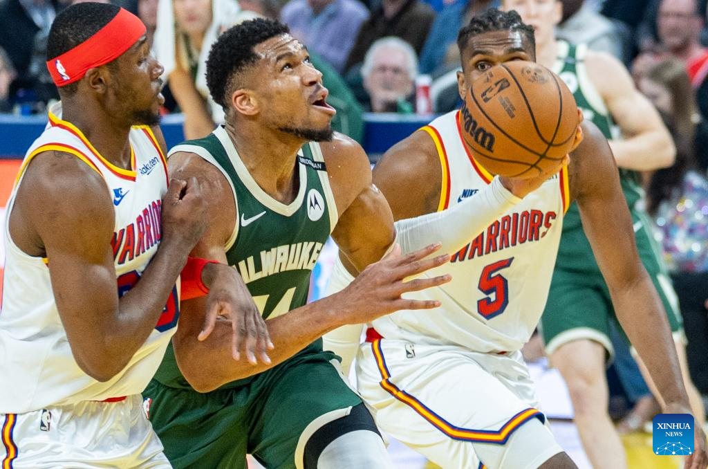 Giannis Antetokounmpo (C) of Milwaukee Bucks breaks through during the 2024-2025 NBA regular season game between Golden State Warriors and Milwaukee Bucks in San Francisco, the United States, March 19, 2025. (Photo by Arthur Dong/Xinhua)