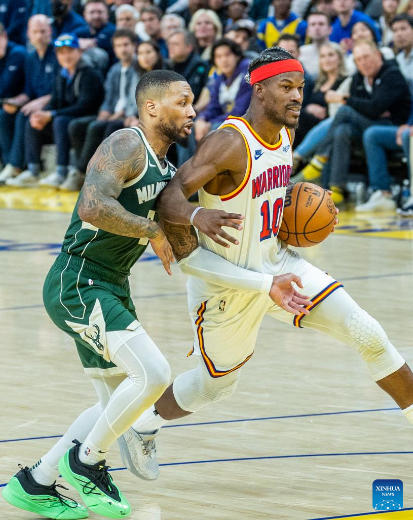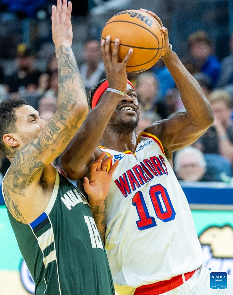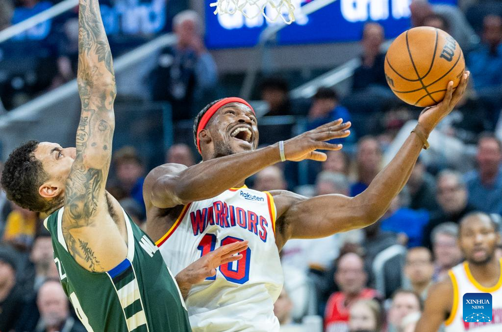 Jimmy Butler (R) of Golden State Warriors breaks through during the 2024-2025 NBA regular season game between Golden State Warriors and Milwaukee Bucks in San Francisco, the United States, March 19, 2025. (Photo by Arthur Dong/Xinhua)
