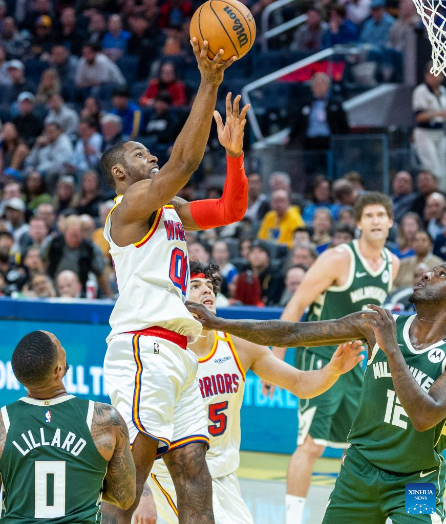 Jonathan Kuminga (2nd L) of Golden State Warriors goes for a layup during the 2024-2025 NBA regular season game between Golden State Warriors and Milwaukee Bucks in San Francisco, the United States, March 19, 2025. (Photo by Arthur Dong/Xinhua)