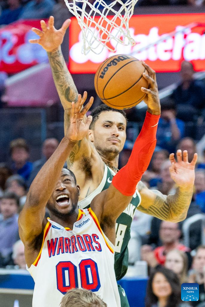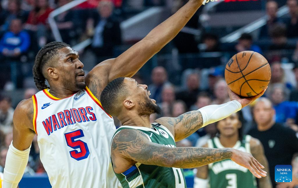 Giannis Antetokounmpo (R) of Milwaukee Bucks breaks through during the 2024-2025 NBA regular season game between Golden State Warriors and Milwaukee Bucks in San Francisco, the United States, March 19, 2025. (Photo by Arthur Dong/Xinhua)