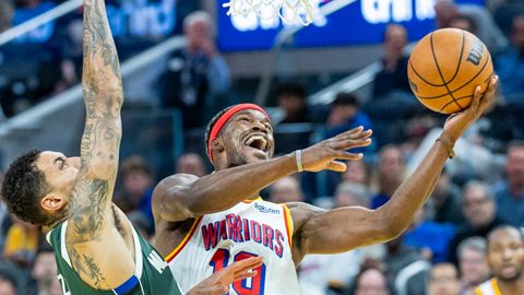 Jimmy Butler (R) of Golden State Warriors goes for a layup during the 2024-2025 NBA regular season game between Golden State Warriors and Milwaukee Bucks in San Francisco, the United States, March 19, 2025. (Photo by Arthur Dong/Xinhua)