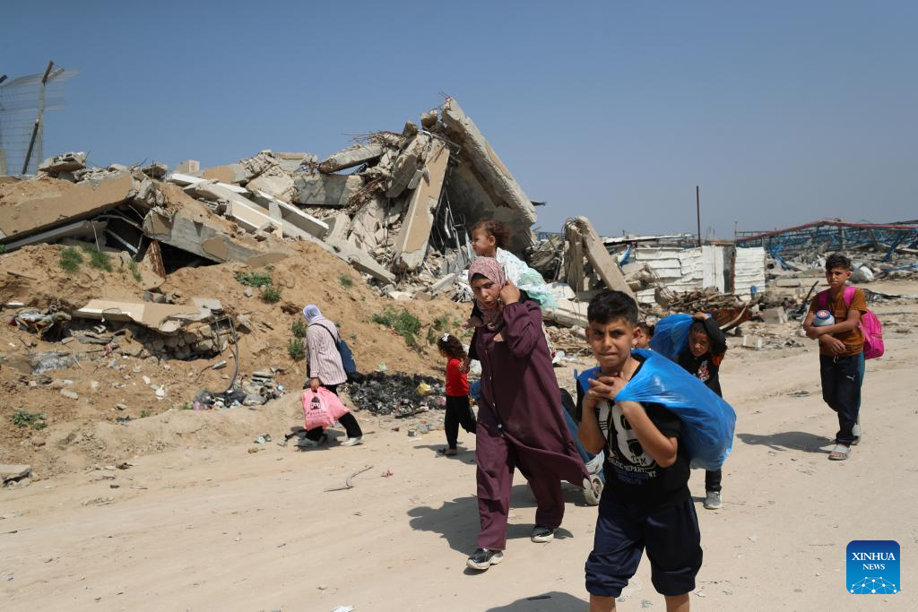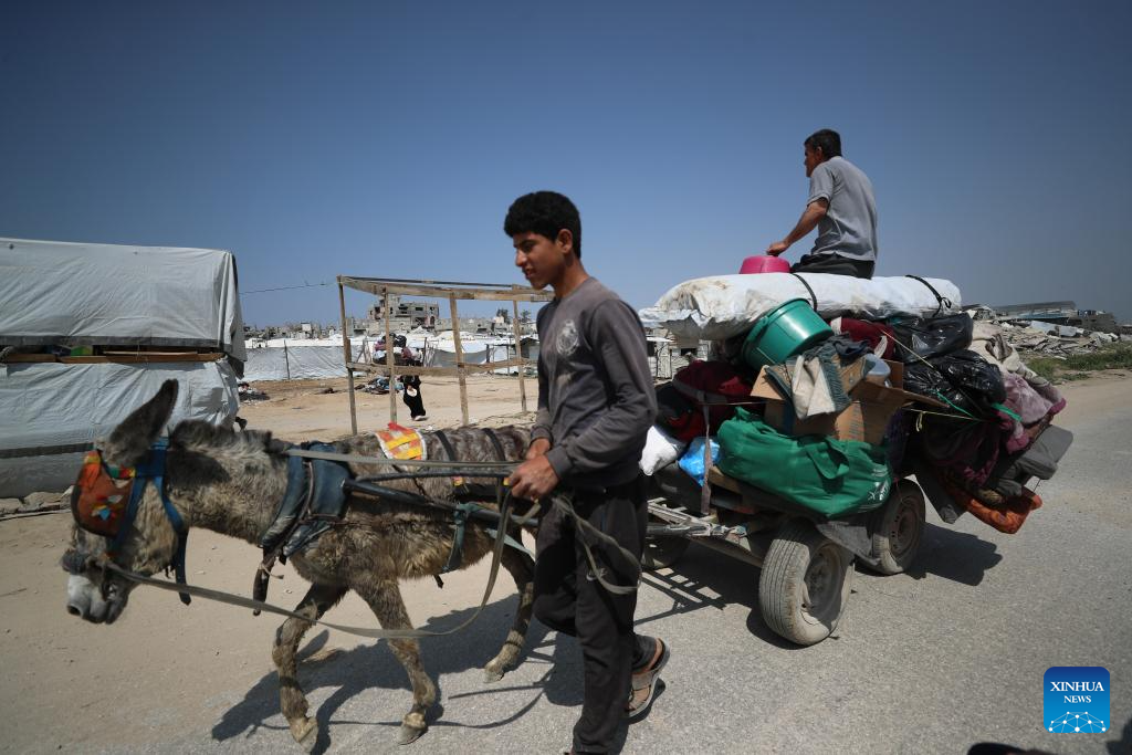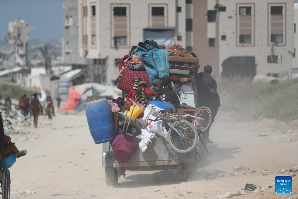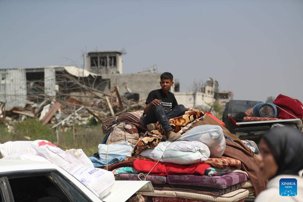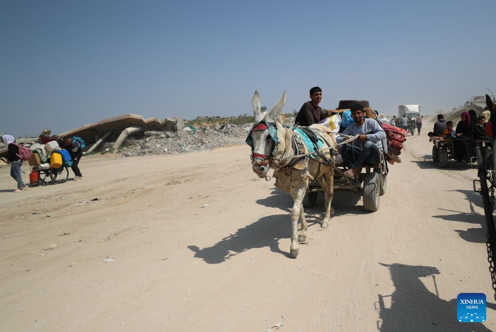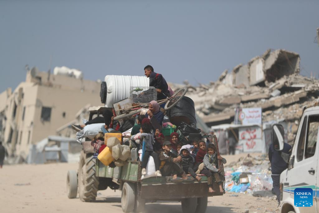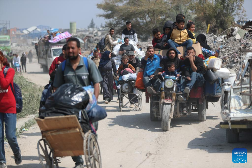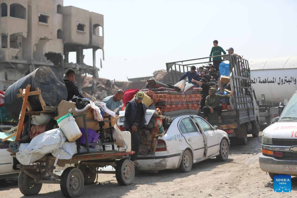 Palestinians fleeing from the northern Gaza Strip city of Beit Hanoun are seen on a road in Gaza City, on March 18, 2025. Israel carried out deadly bombardments across the Gaza Strip early Tuesday, killing more than 400 people, as it vowed to intensify attacks if Hamas did not release the hostages still held in the enclave. After the deadly attacks, the Israeli army issued evacuation orders, prompting Palestinians to flee in chaos. Israeli military's Arabic-language spokesperson, Avichay Adraee, called on civilians to move west. A map he posted on social media platform X marked in red the entire perimeter around Gaza, designating it as a "dangerous combat zone." The targeted areas included the city of Beit Hanoun, the town of Khuza'a, and the Abasan suburbs of Khan Younis. (Photo by Mahmoud Zaki/Xinhua)